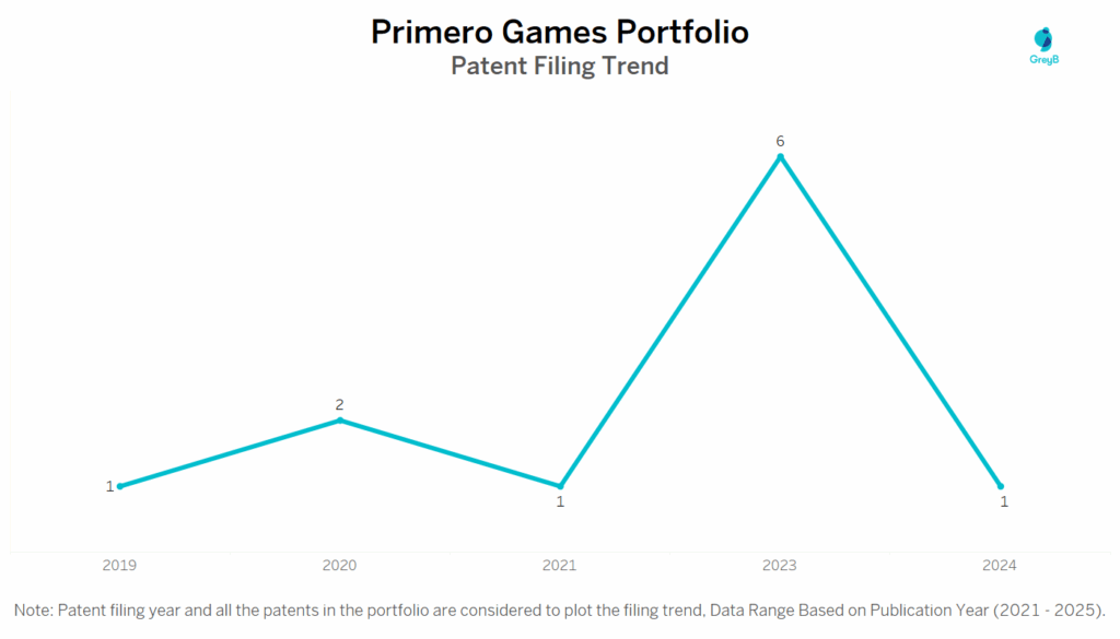 Primero Games has a total of 11 patents globally, out of which 5 have been granted. Of these 11 patents, 100% patents are active. United States of America is where Primero Games has filed their all the patents. Parallelly, the United States of America seems to be the main focused R&D centre and is the origin country of Primero Games.