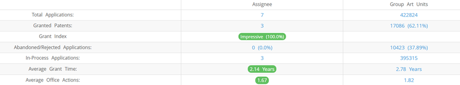 Primero Games (Excluding its subsidiaries) has filed 7 patent applications at USPTO so far (Excluding Design and PCT applications). Out of these 3 has been granted leading to a grant rate of 100%.