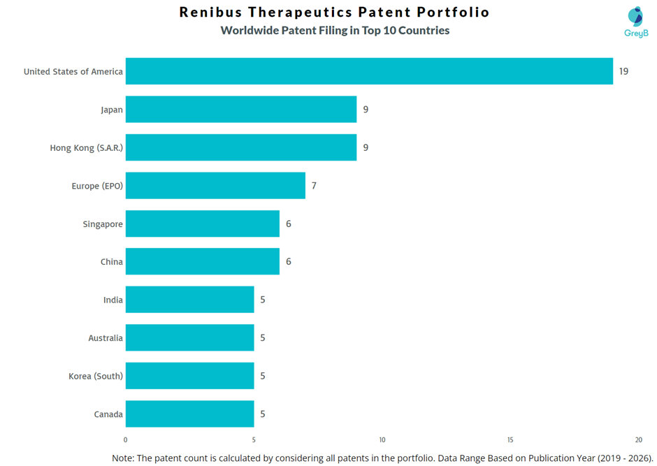 Renibus Therapeutics has a total of 117 patents globally, out of which 33 have been granted. Of these 117 patents, more than 82% patents are active. United States of America is where Renibus Therapeutics has filed the maximum number of patents, followed by Japan and Hong Kong. Parallelly, USA seems to be the main focused R&D centre and also is the origin country of Renibus Therapeutics.