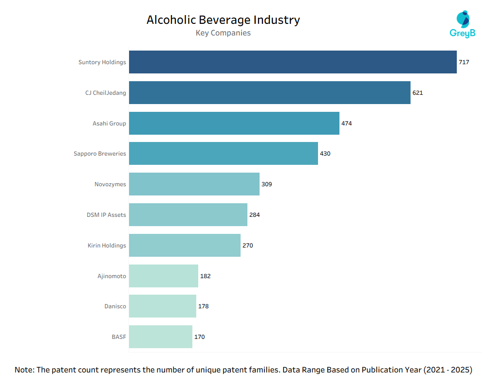 Notable among those leading in the number of patent families are Suntory Holdings, CJ CheilJedang, and Asahi Group Holdings, while Sapporo Breweries and Kirin Holdings add more Japanese companies to the list of key market players.