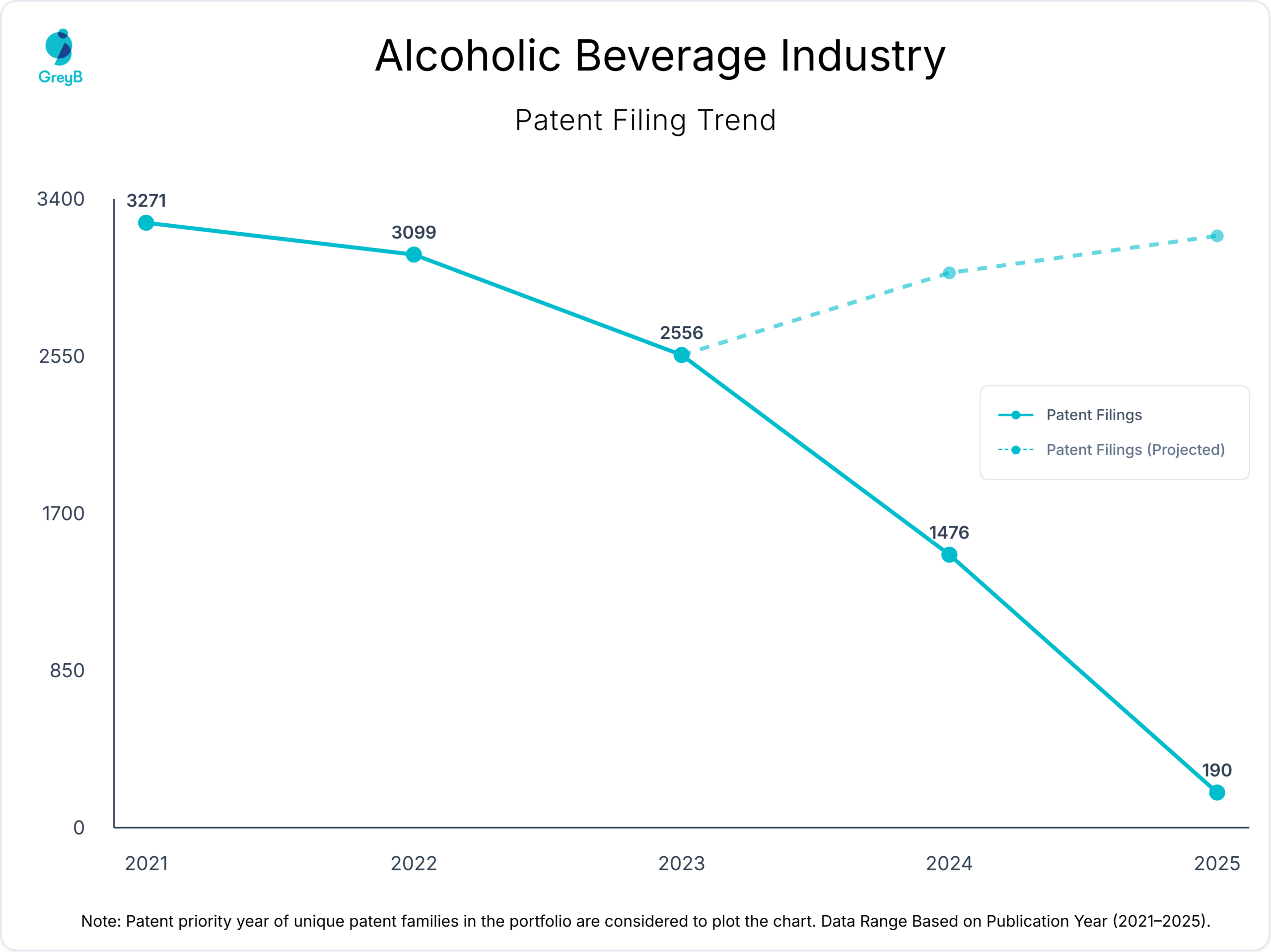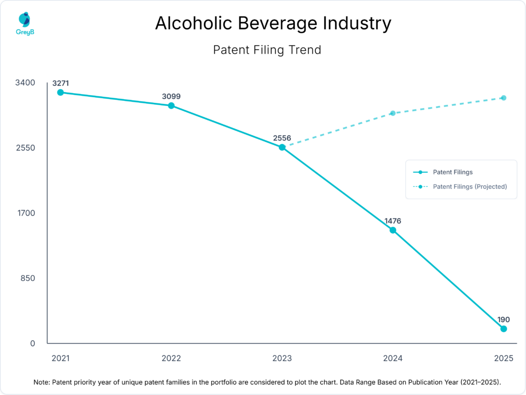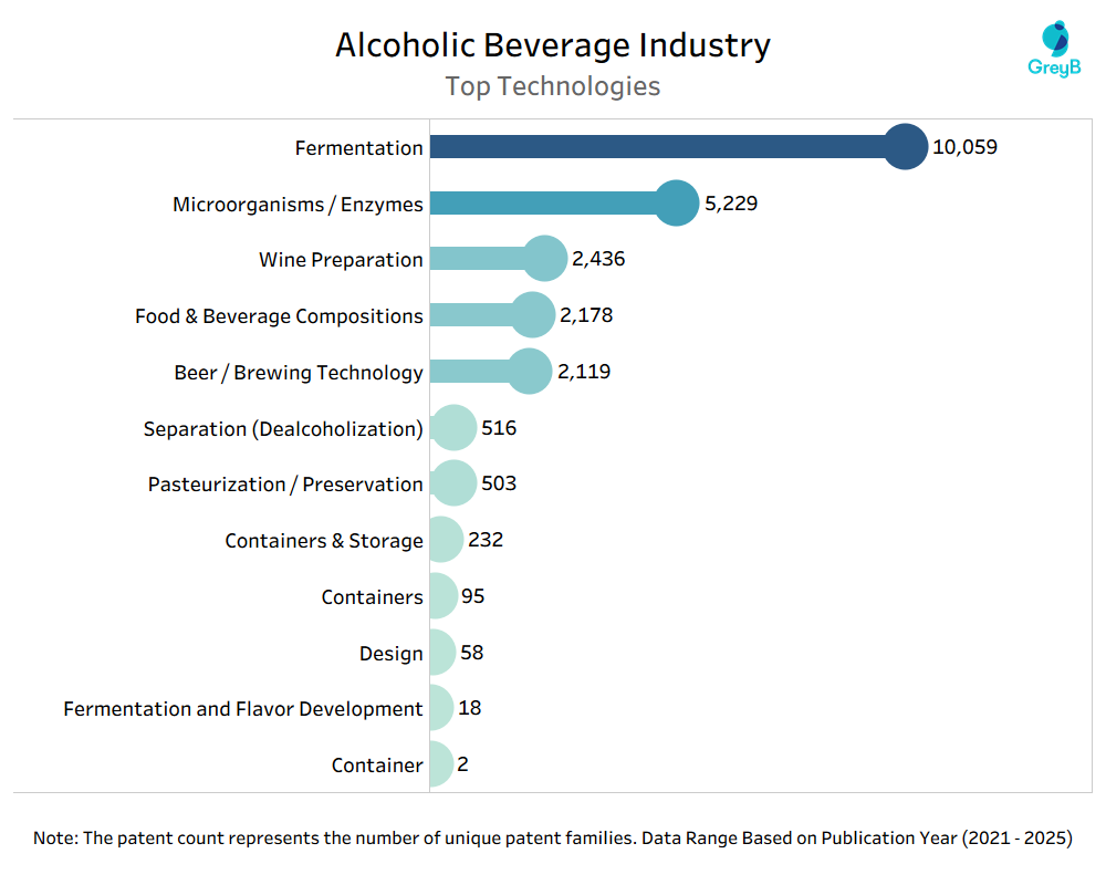 Fermentation technology dominates innovation (44%), followed by microorganisms and enzymes (23%) and wine preparation (11%). While patent publications appear to decline-from 3,271 in 2021 to 190 in 2025-this reflects the 18-month publication lag rather than reduced activity. In reality, companies are becoming more strategic, focusing on high-quality patents, trade secrets, and the growing demand for low- and no-alcohol beverages.