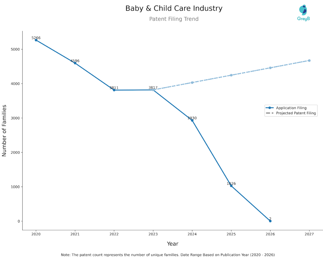 The projected trajectory tells the real story: filings are expected to rebound toward ~4,600 families by 2027, almost matching the 2020 peak. In the context of slowing global birth rates, the baby care market is accelerating its transformation from large-scale expansion to value-driven growth and the patent pipeline reflects exactly that shift.
