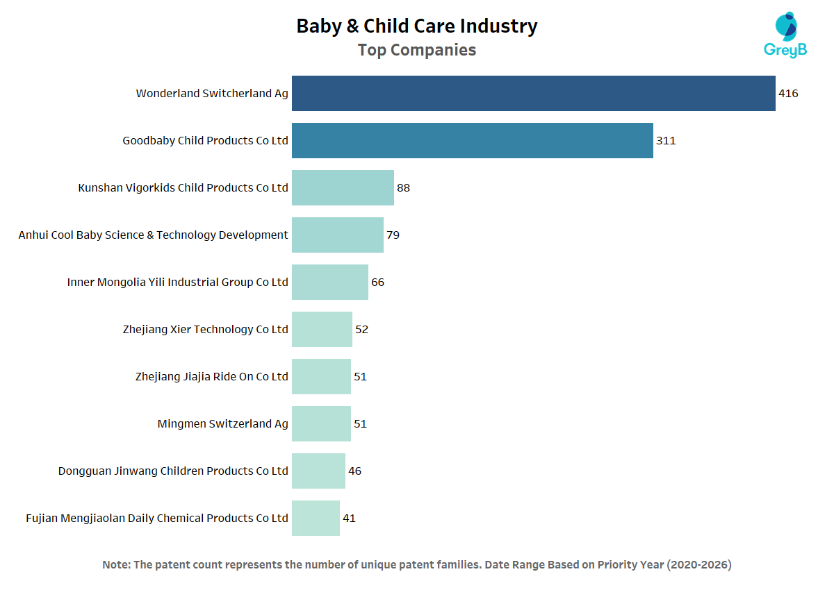 Rank-list of top companies/assignees in the Baby & Child Care Products patent landscape and their filing trends.
