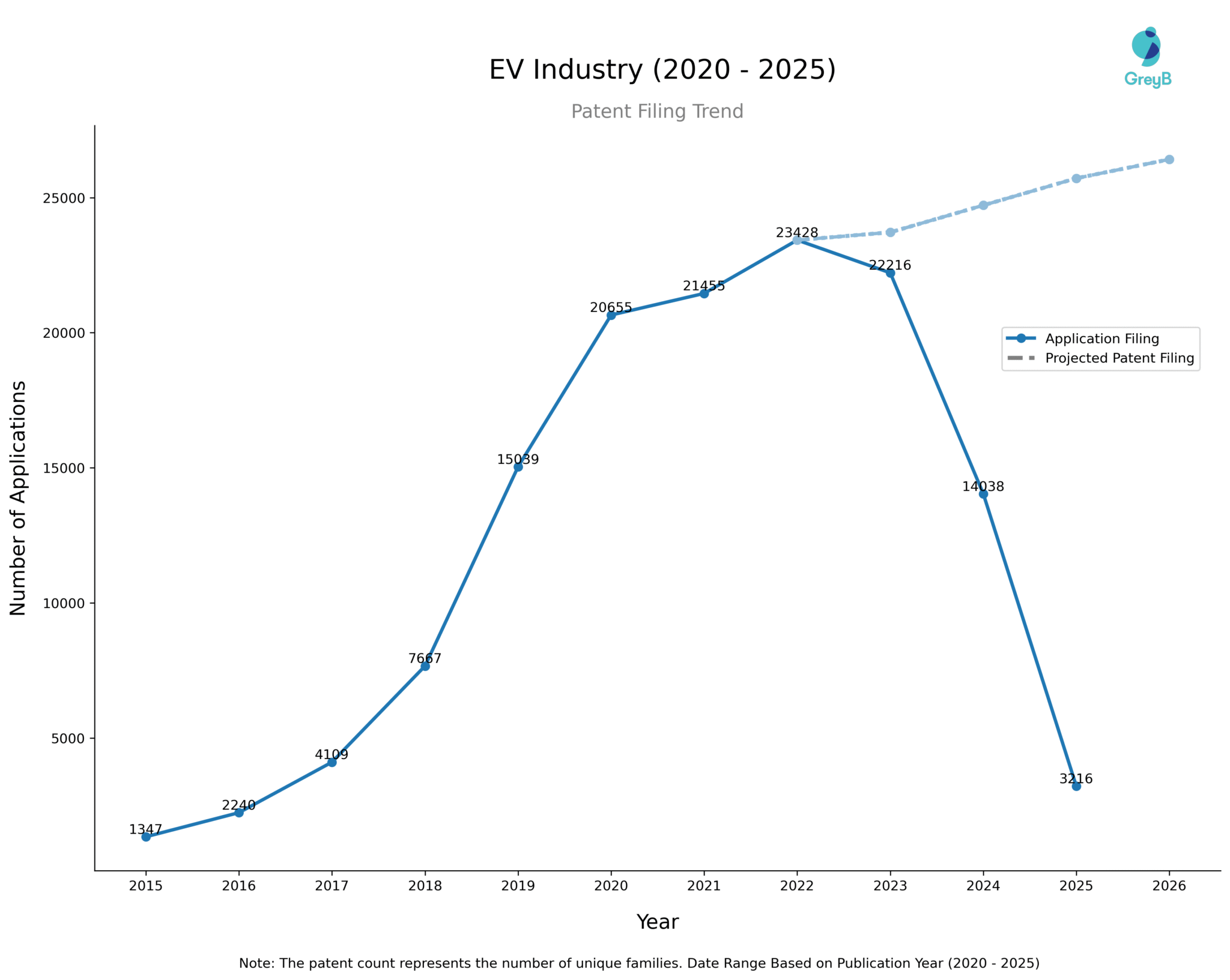 The EV industry has witnessed an explosive rise in patent filings from 2015 to 2022, driven by breakthroughs in battery chemistry, charging technologies, and power electronics.