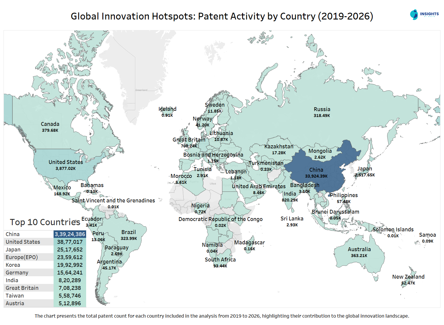 India is emerging as a key growth driver. With over 820K patents filed between 2019 and 2026, it has recorded six consecutive years of double-digit growth-the only major economy to do so.