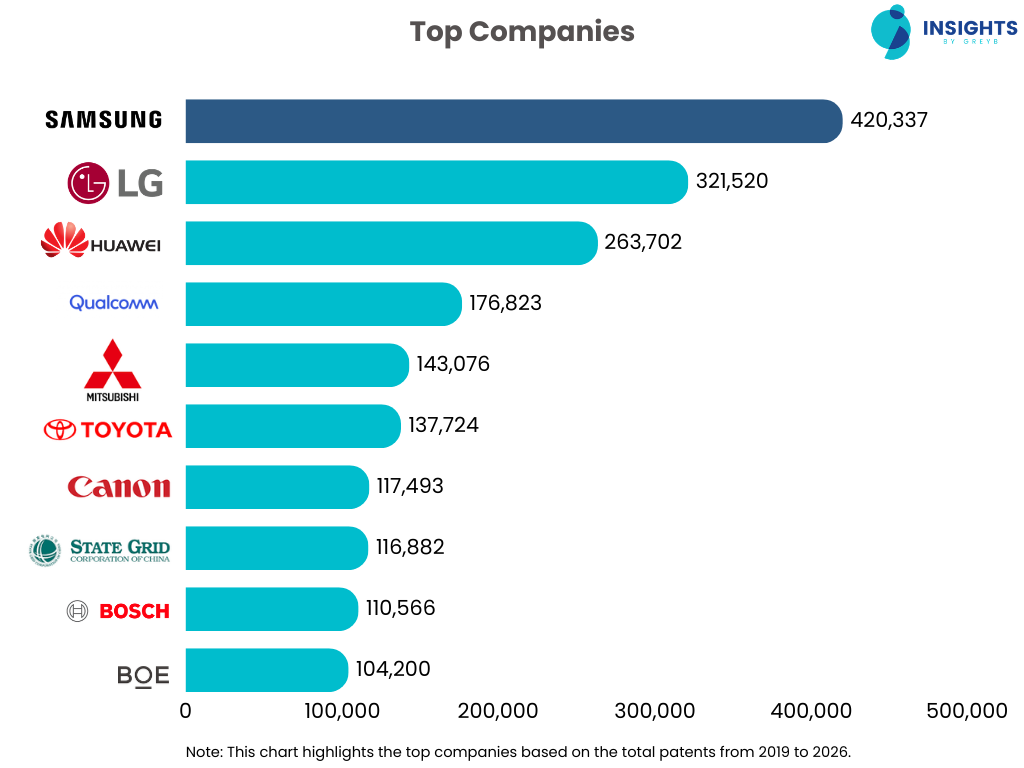 This chart highlights the top companies shaping global patent activity and their strategic focus.