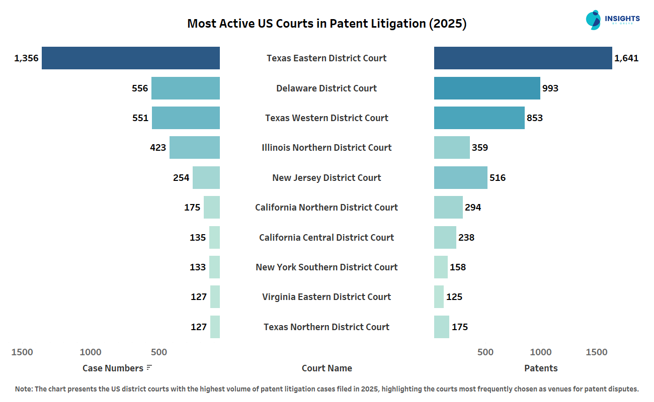 Overall, US patent litigation shows a two-tier system: high-volume, lower-complexity cases in EDTX and WDTX, and lower-volume, higher-complexity disputes in Delaware and similar courts.