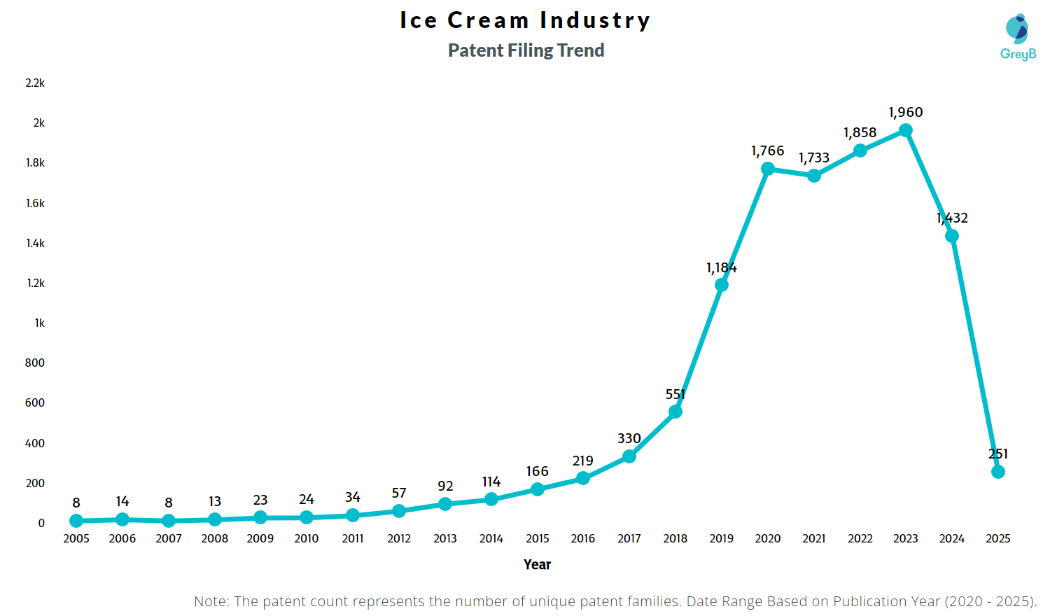 Innovation in the ice cream industry has grown rapidly over the last two decades. After steady increases post-2010, filings surged around 2018-2019 with the rise of health-focused, sustainable, and food-tech advancements.