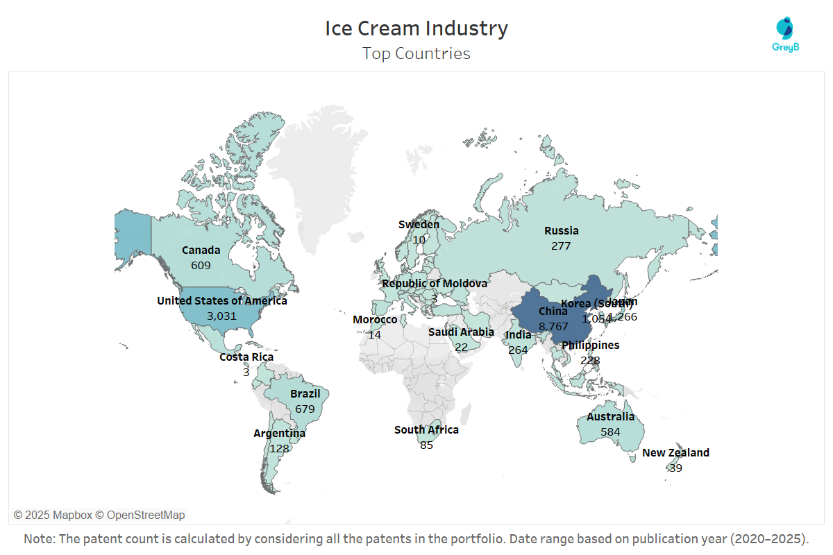 Innovation in the ice cream industry is led largely by Asia, with China emerging as the top patent contributor. China holds over 40% of active global ice cream patents, driven by advancements in dairy processing, frozen dessert technology, and alternative formulations.