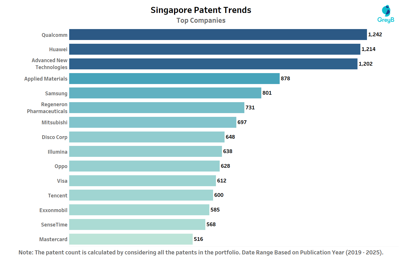 This ranking highlights how Singapore is being used as a strategic filing hub rather than a purely domestic innovation base. Most top filers including companies like Qualcomm, Huawei, Samsung, Mitsubishi, OPPO, Visa, Tencent, ExxonMobil and others are headquartered outside Singapore, indicating that global players rely on Singapore for broader Asia-Pacific coverage.