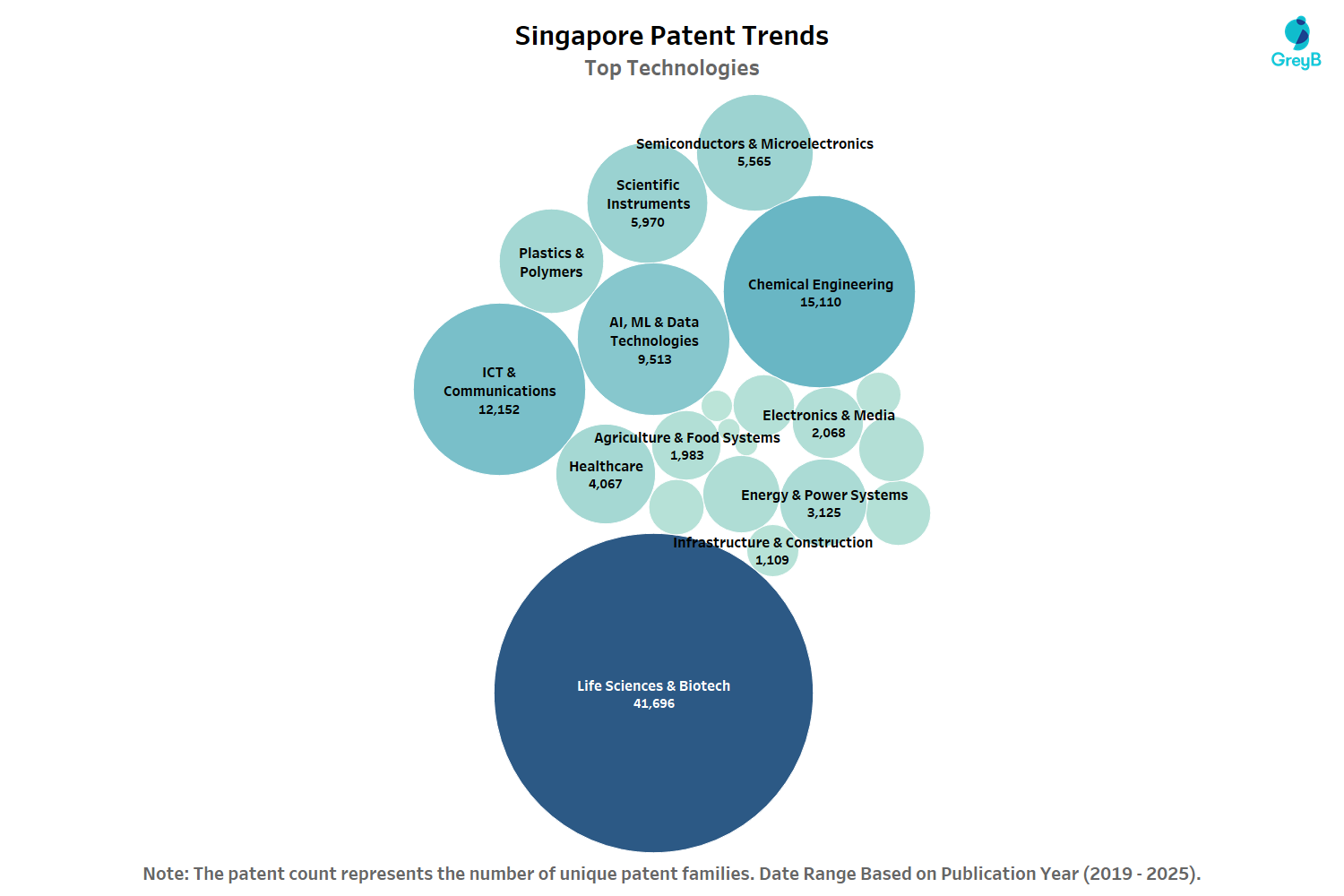 Life Sciences claims the largest share of filings by far. This aligns with Singapore’s deliberate positioning as a biotech and med‑tech innovation hub. Global pharmaceutical player Eli Lilly and Company launched a S$42 million Digital Health Innovation Hub in Singapore in 2024 to develop wearable sensor tech and AI‑driven health platforms. This signals that life sciences patents here are not just domestic efforts, they form part of multinational R&D anchoring in Singapore.