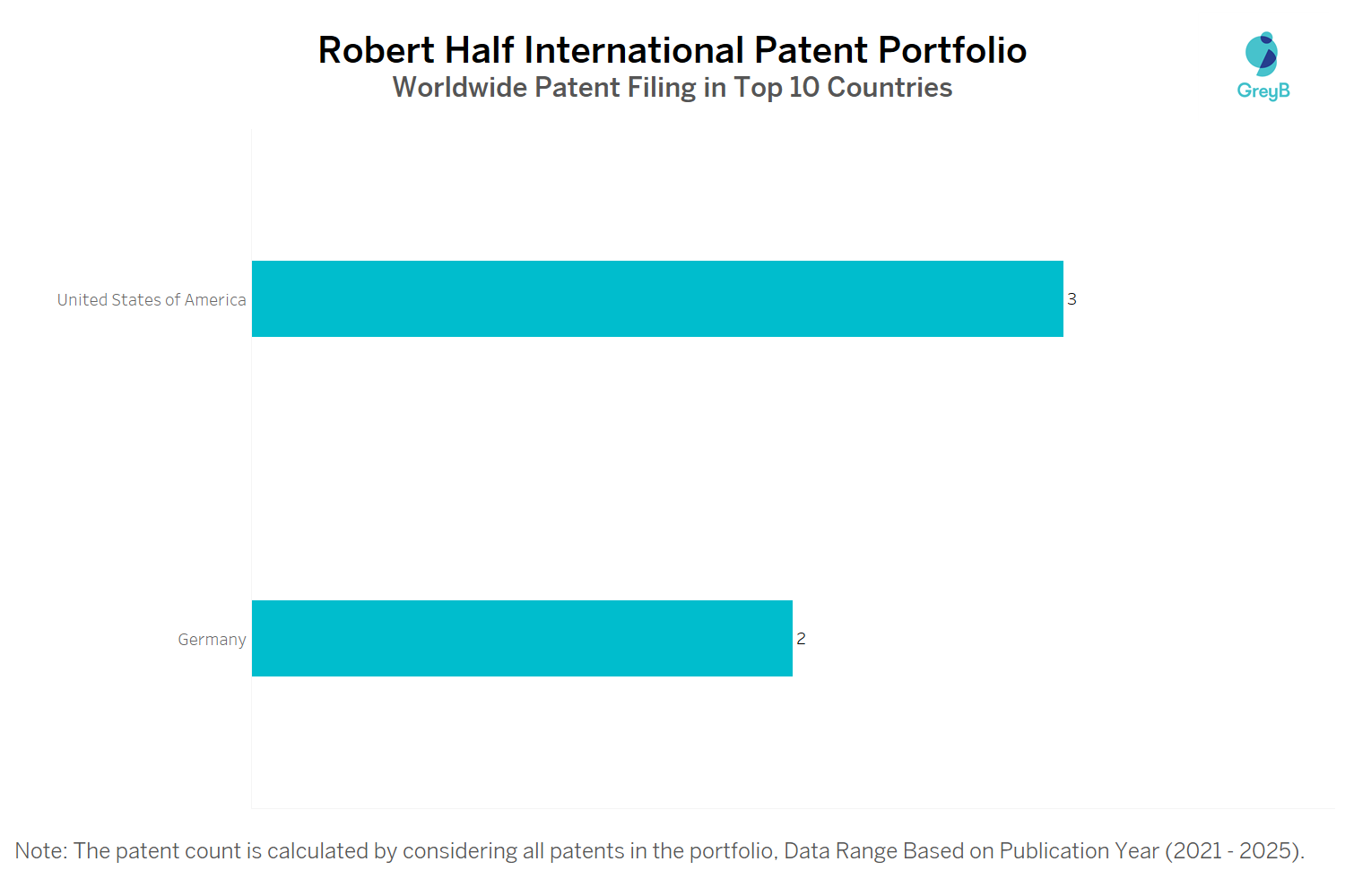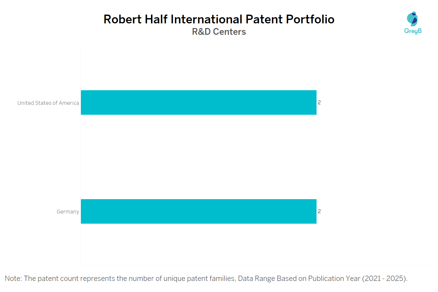 Robert Half International has a total of 6 patents globally, out of which 1 has been granted. Of these 6 patents, all patents are active. United States of America is where Robert Half International has filed the maximum number of patents, followed by Germany. Parallelly, United States of America seems to be the main focused R&D centre and also is the origin country of Robert Half International.