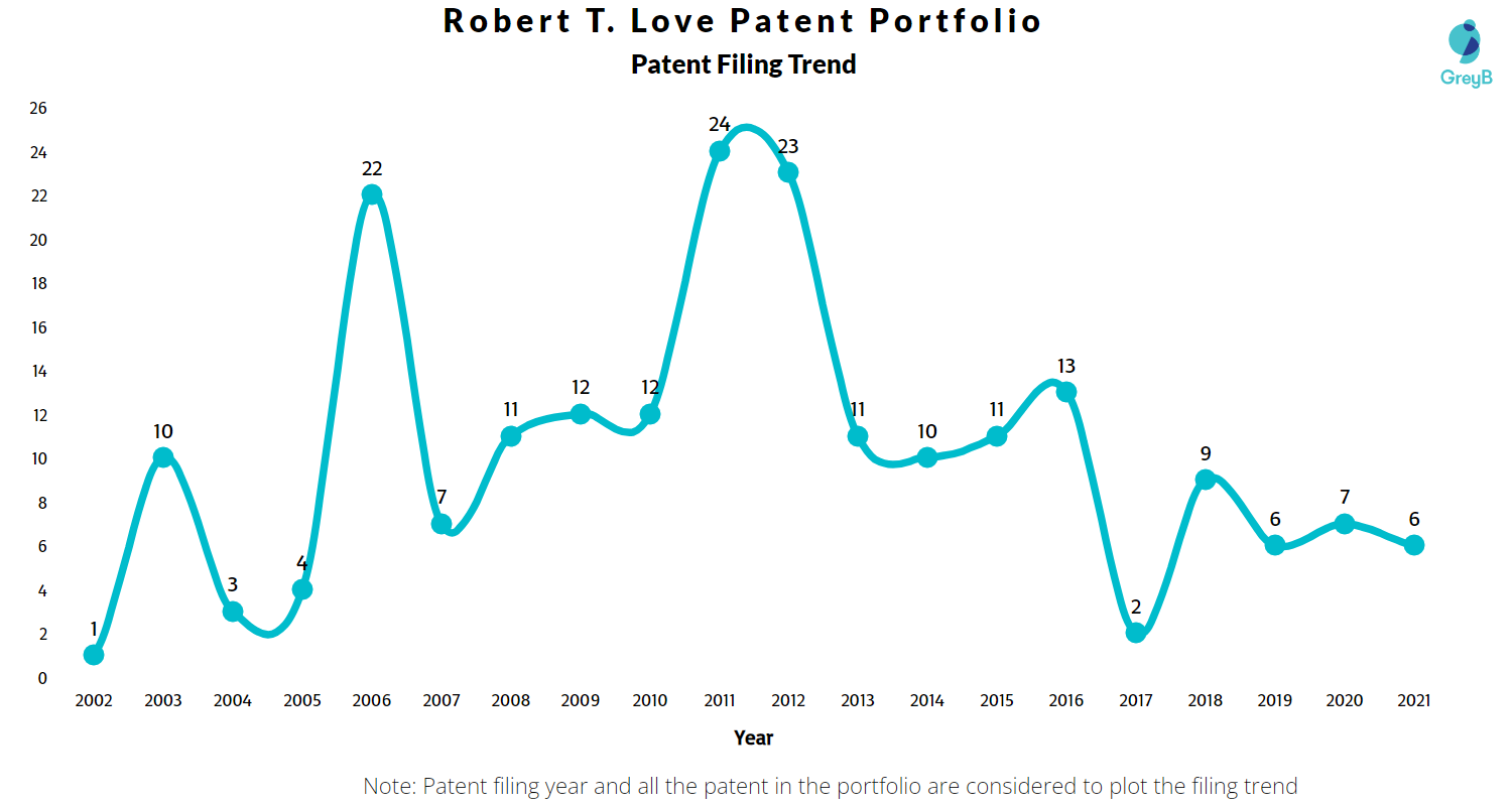 Do read about some of the most popular patents of Robert T Love which have been covered by us in this article and also you can find his patents filing trend over the years, the worldwide coverage and many other stats over Robert T Love patent portfolio.