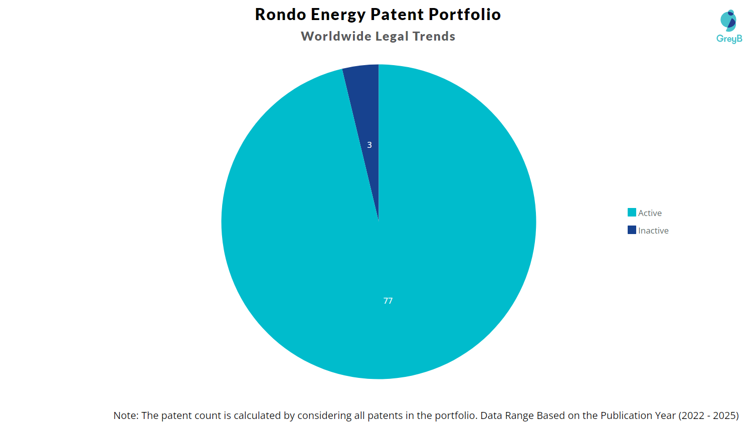 Rondo Energy has a total of 80 patents globally. These patents belong to 4 unique patent families. Out of 80 patents, 77 patents are active.