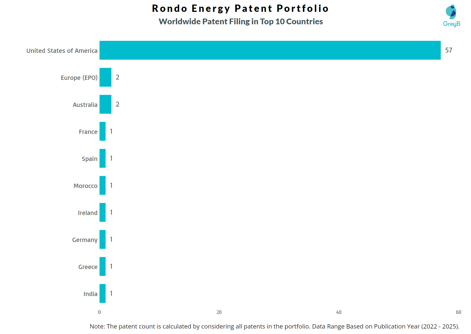 Rondo Energy has a total of 80 patents globally, out of which 47 have been granted. Of these 80 patents, more than 96% patents are active. United States of America is where Rondo Energy has filed the maximum number of patents, followed by Europe (EPO) and Australia. Parallelly, United States of America seems to be the main focused R&D centre and also is the origin country of Rondo Energy.