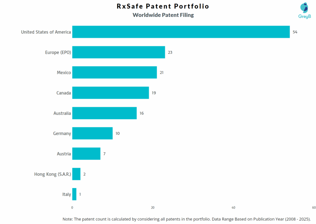 RxSafe has a total of 166 patents globally, out of which 100 have been granted. Of these 166 patents, more than 85% patents are active. United States of America is where RxSafe has filed the maximum number of patents, followed by Europe (EPO) and Mexico. Parallelly, United States of America seems to be the main focused R&D centre and also is the origin country of RxSafe.