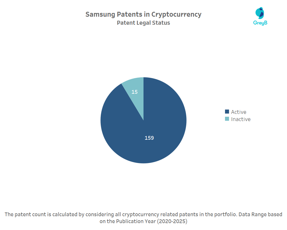 Samsung has a total of 174 patents globally in Cryptocurrency. These patents belong to 135 unique patent families. Out of 174 patents, 159 patents are active.