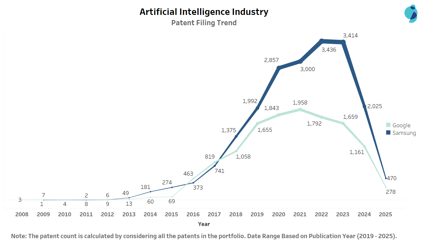 Samsung’s AI filings show a steady upward trend, peaking in 2022, Google’s filings have been less consistent, spiking around product releases or new AI architecture unveilings.