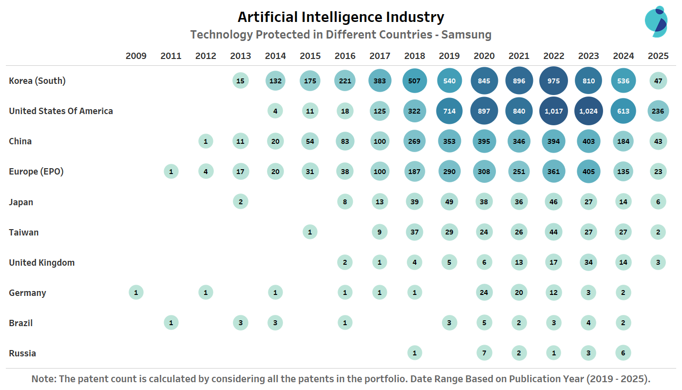 Samsung leads in volume, filing nearly 2x the number of AI patents as Google between 2019 and 2024.