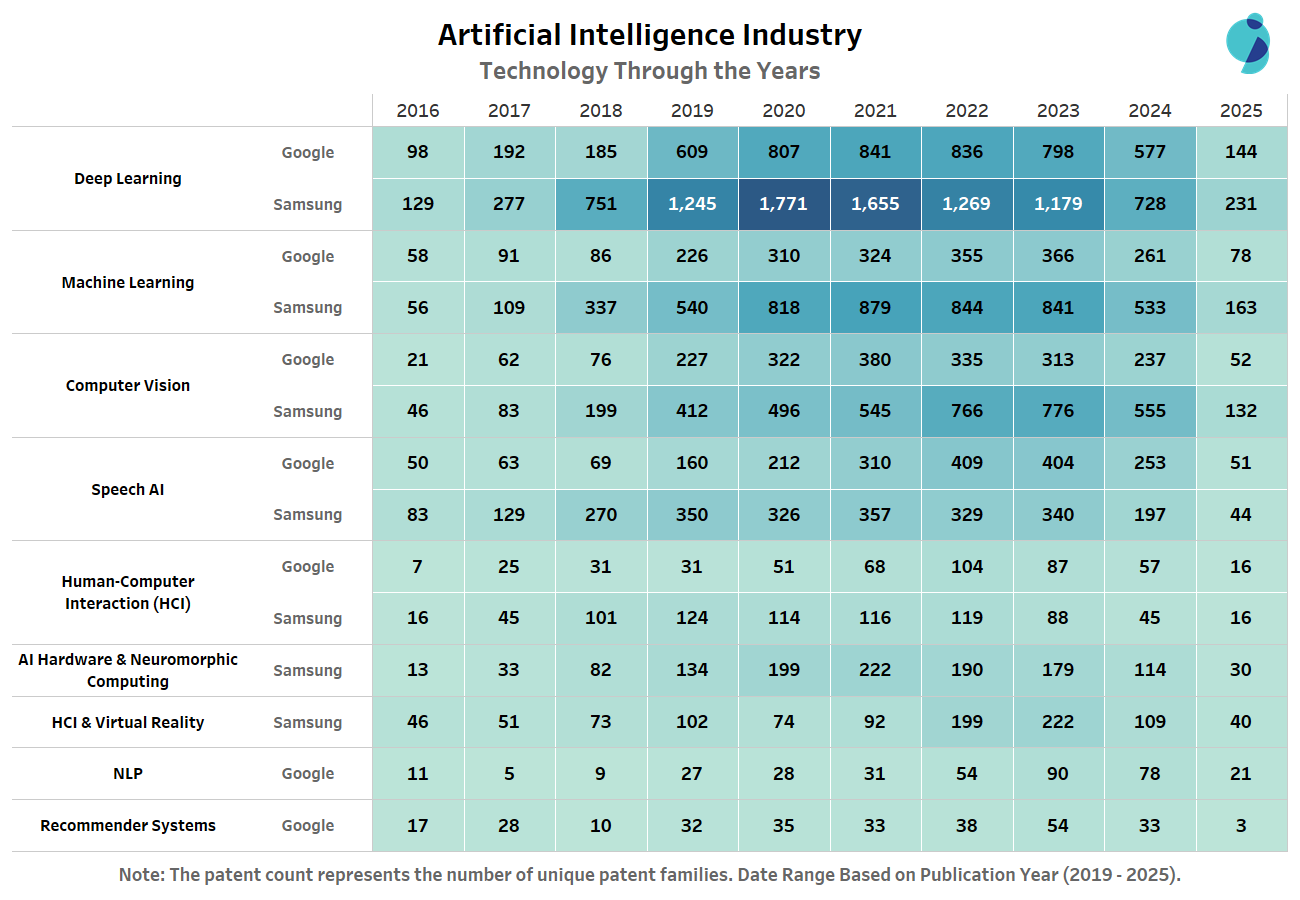 Samsung shows sustained investment in computer vision, NLP, and autonomous systems, Google’s newer filings lean toward privacy-preserving AI, energy-efficient models, and model compression.