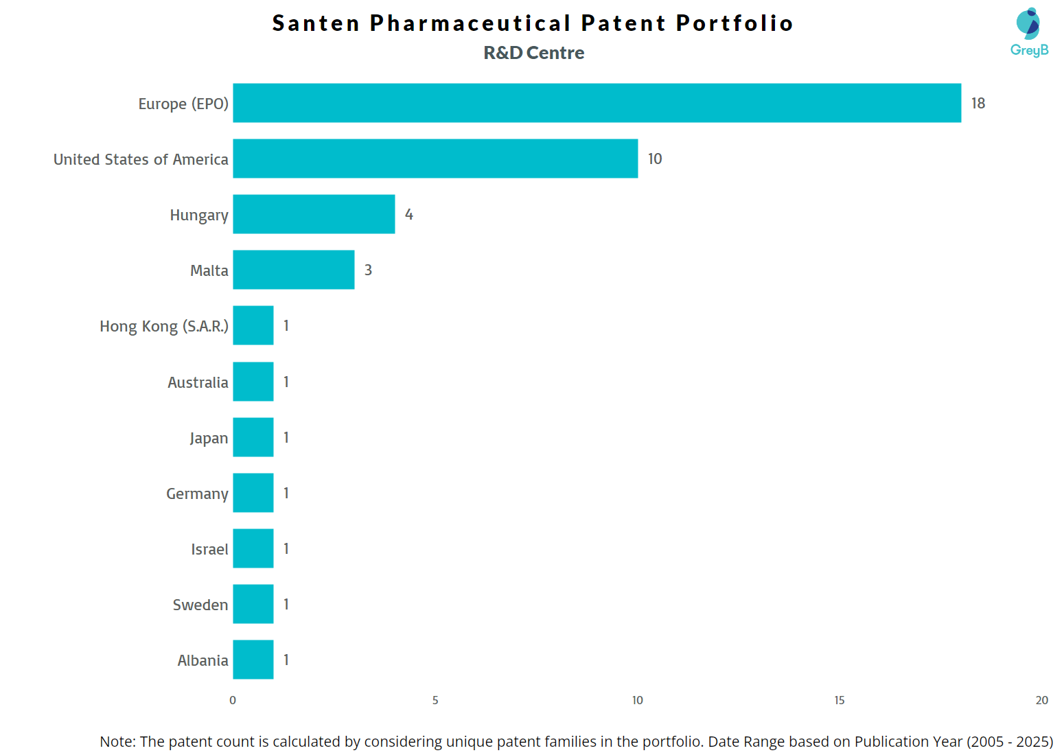 Santen Pharmaceutical has a total of 361 patents globally, out of which 249 have been granted. Of these 361 patents, more than 51% patents are active. The United States of America is where Santen Pharmaceutical has filed the maximum number of patents, followed by Japan and Germany. Parallelly, Europe (EPO) seems to be the main focused R&D centre and also Japan is the origin country of Santen Pharmaceutical.