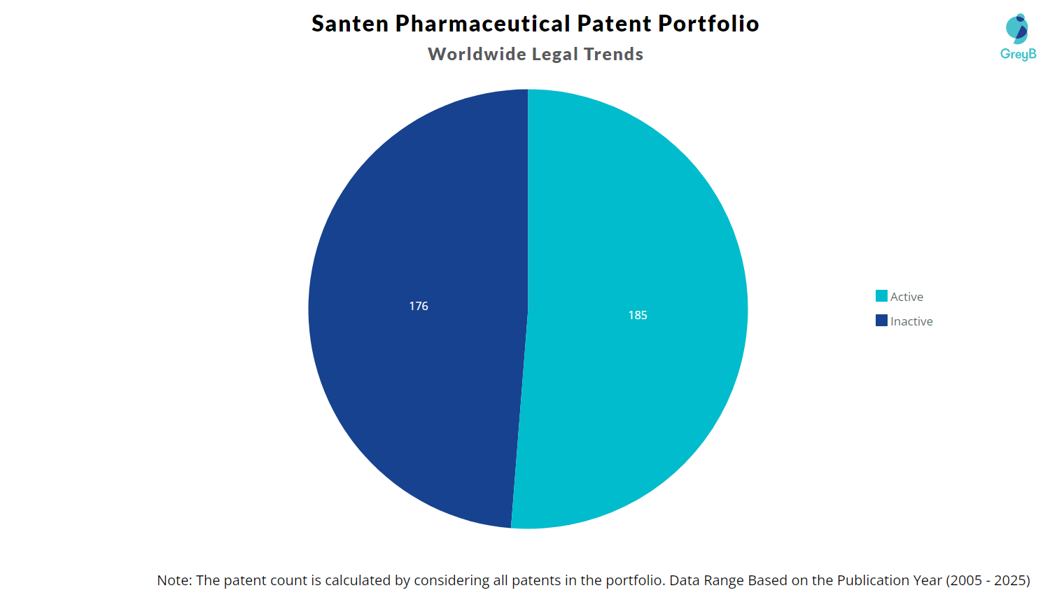 Santen Pharmaceutical has a total of 361 patents globally. These patents belong to 42 unique patent families. Out of 361 patents, 185 patents are active.