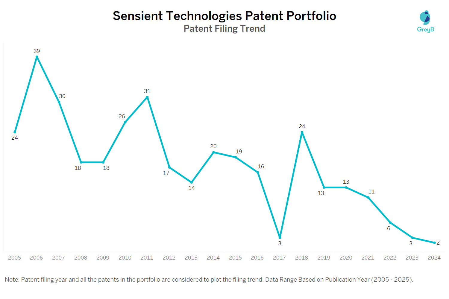 | Year of Patents Filing or Grant | Sensient Technologies Applications Filed | Sensient Technologies Patents Granted |