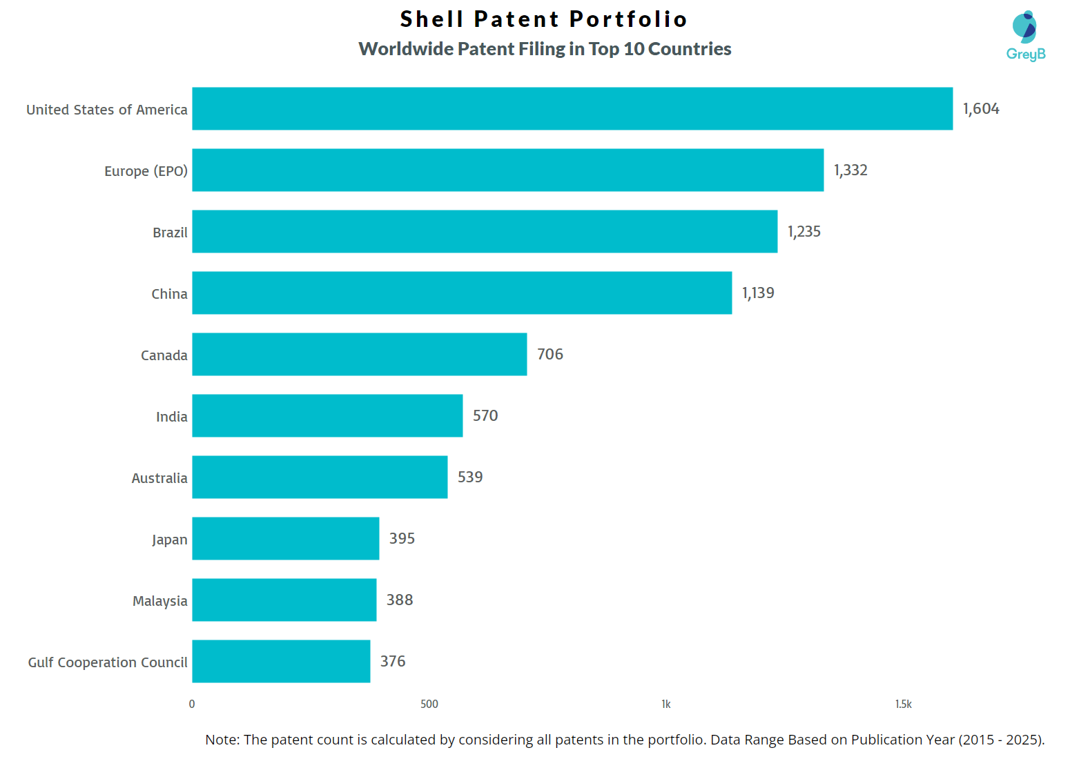 Shell has a total of 12506 patents globally, out of which 6149 have been granted. Of these 12506 patents, more than 69% patents are active. The United States of America is where Shell has filed the maximum number of patents, followed by Europe (EPO) and Brazil. Parallelly, Europe (EPO) seems to be the main focused R&D centre and also United Kingdom is the origin country of Shell.