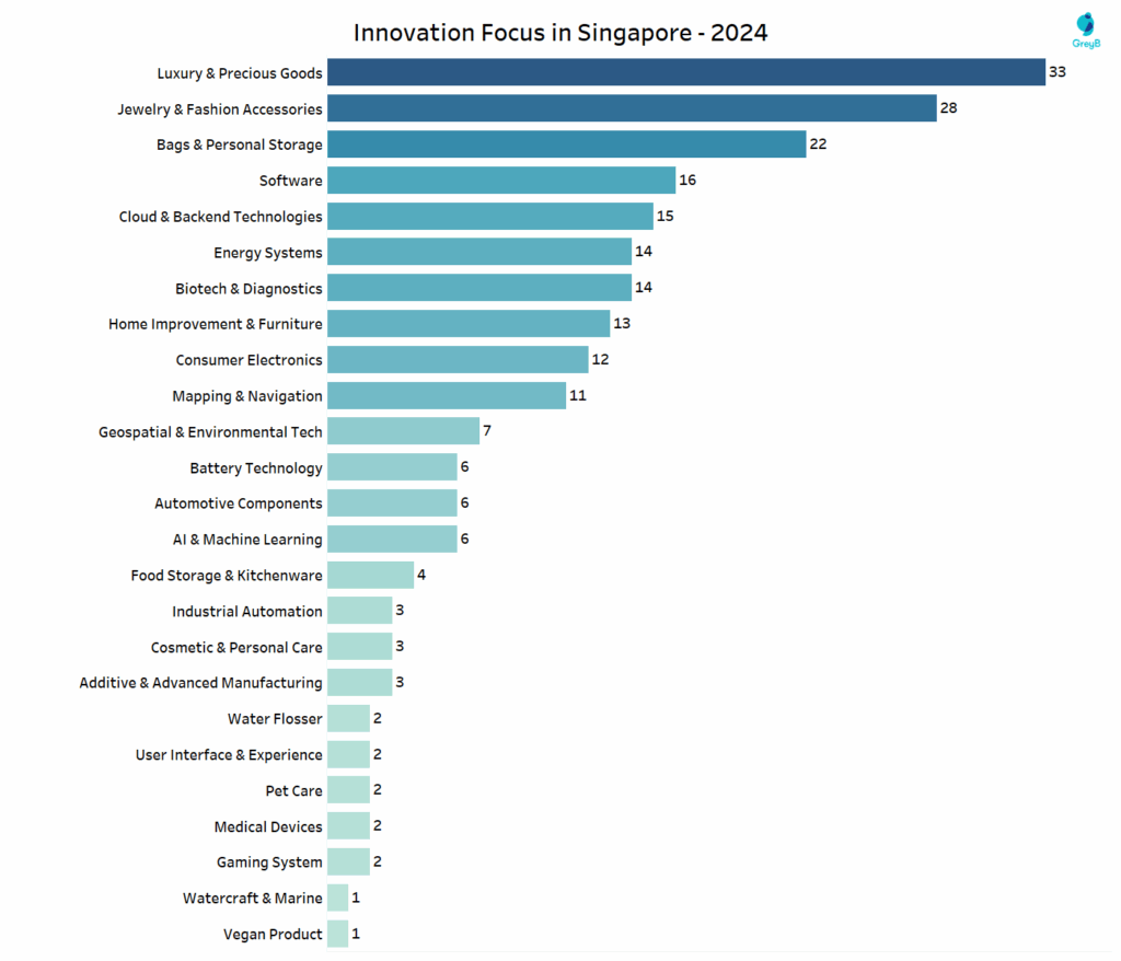 Singapore’s 2024 patent activity offers a refreshing — and at times unexpected — view of its innovation priorities. While AI or biotech might seem like the obvious leaders, it’s Luxury & Precious Goods and Fashion Accessories that top the list, led by companies blending traditional craftsmanship with modern technologies. At the same time, areas such as Software, Cloud Technologies, Biotech, and Energy Systems are showing steady growth, in step with national efforts to invest in digital infrastructure and sustainable development.