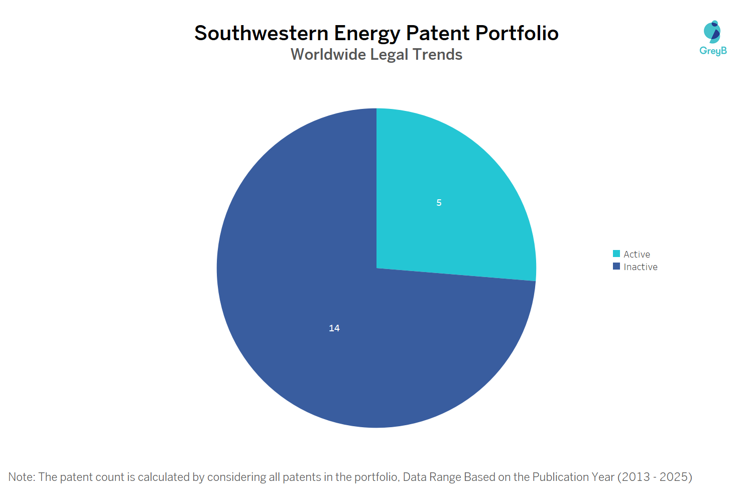 Southwestern Energy has a total of 19 patents globally. These patents belong to 4 unique patent families. Out of 19 patents, 5 patents are active.