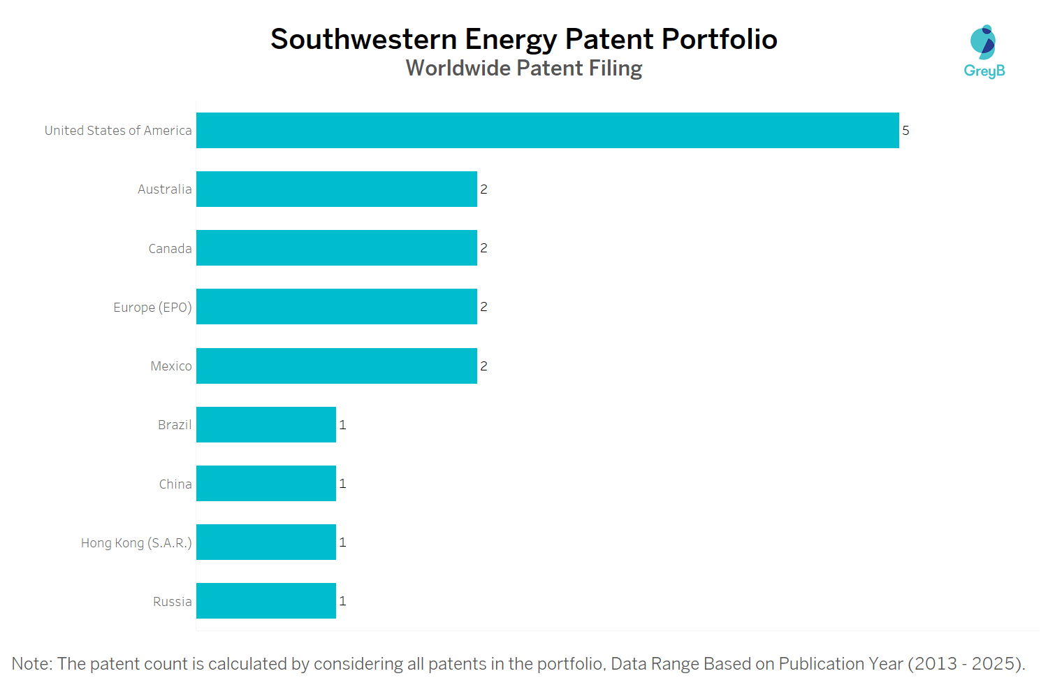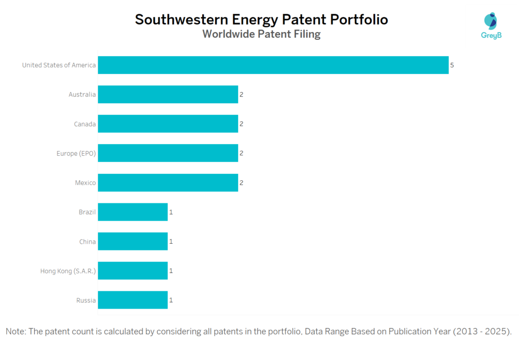 Southwestern Energy has a total of 19 patents globally, out of which 6 have been granted. Of these 19 patents, more than 26% patents are active. United States of America is where Southwestern Energy has filed the maximum number of patents, followed by Australia and Europe (EPO). Parallelly, United States of America seems to be the main focused R&D centre and also is the origin country of Southwestern Energy.