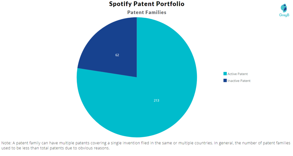 Spotify has a total of 1124 patents globally. These patents belong to 516 unique patent families. Out of 1124 patents, 887 patents are active.