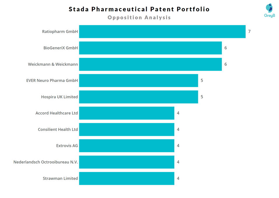Analysis of STADA’s European (EP) patent shows active opposition from multiple players, with the number of oppositions per company ranging from 4 to 7. This indicates a competitive landscape where certain patents are highly targeted, reflecting strong interest in challenging STADA’s intellectual property.
