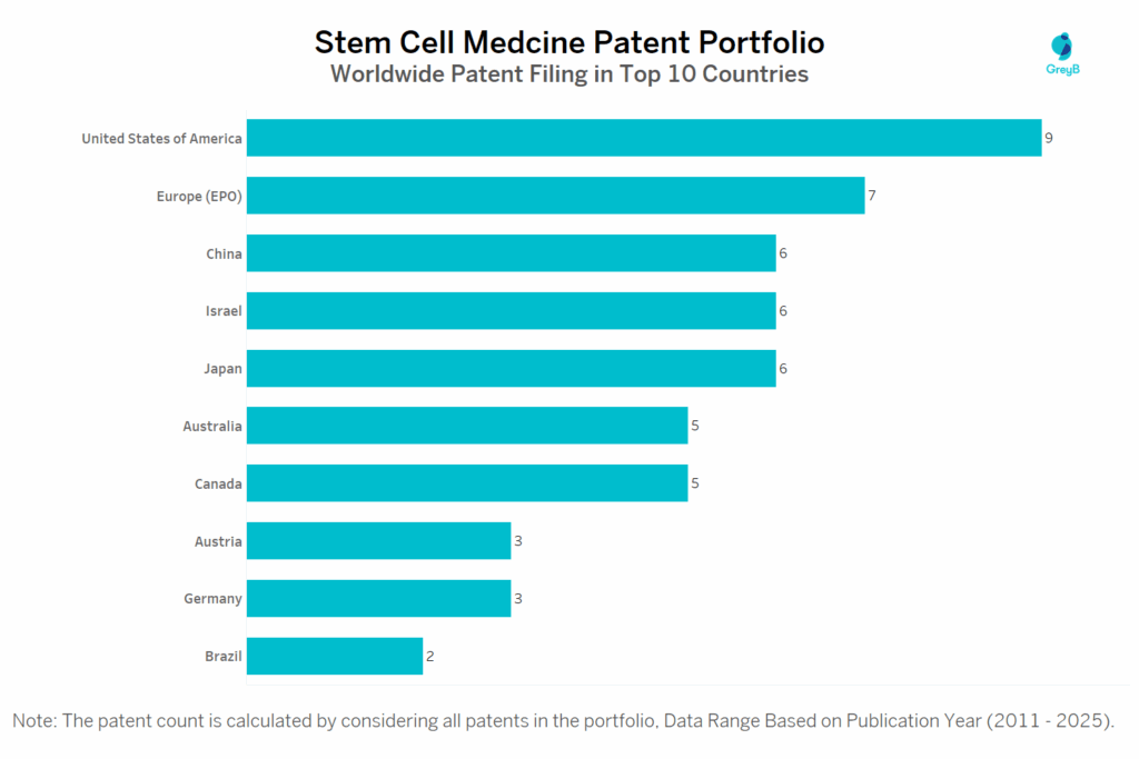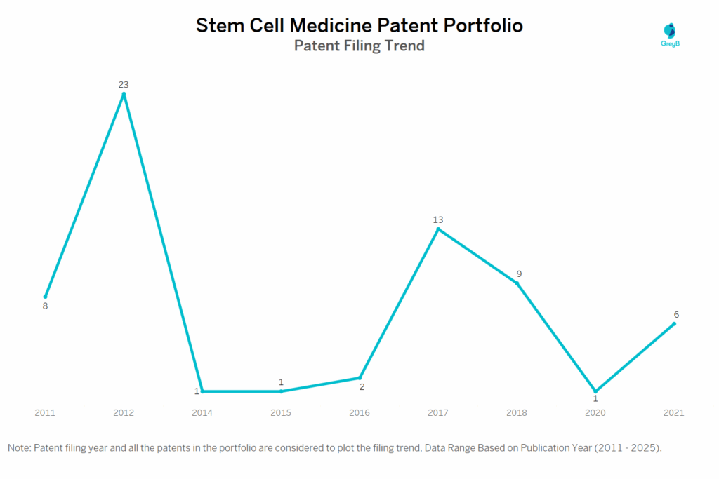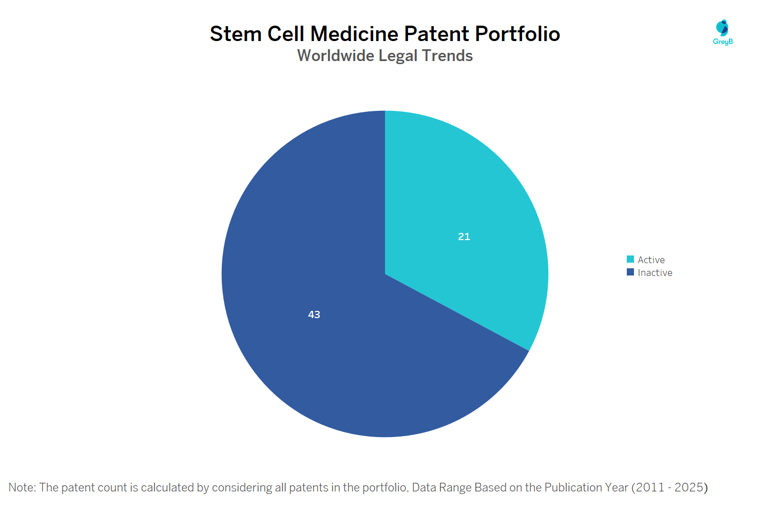 Stem Cell Medicine has a total of 64 patents globally. These patents belong to 8 unique patent families. Out of 64 patents, 21 patents are active.