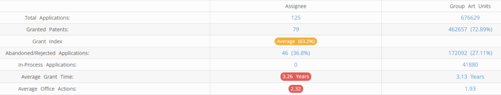 SuccessFactors (Excluding its subsidiaries) has filed 125 patent applications at USPTO so far (Excluding Design and PCT applications). Out of these 79 have been granted leading to a grant rate of 63.2%.