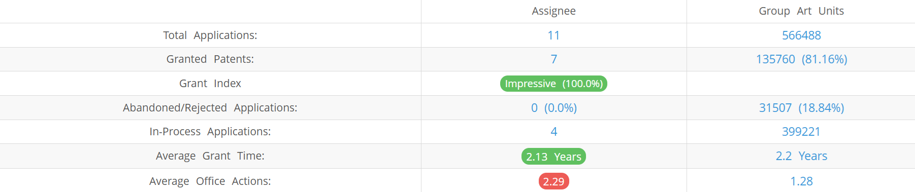 Swidget (Excluding its subsidiaries) has filed 11 patent applications at USPTO so far (Excluding Design and PCT applications). Out of these 7 have been granted leading to a grant rate of 100.0%.