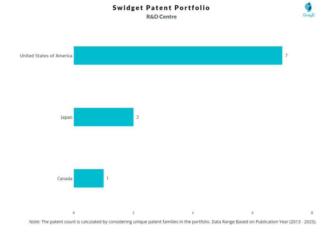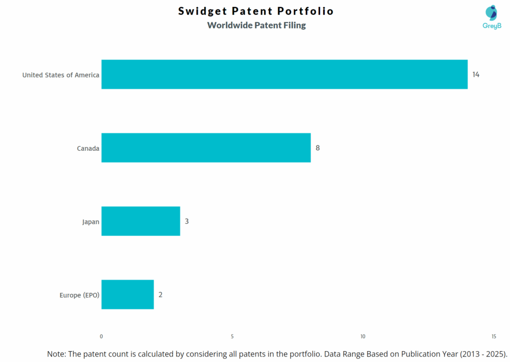 Swidget has a total of 31 patents globally, out of which 19 have been granted. Of these 31 patents, more than 94% patents are active. United States of America is where Swidget has filed the maximum number of patents, followed by Canada and Japan. Parallelly, United States of America seems to be the main focused R&D centre and Canada is the origin country of Swidget.