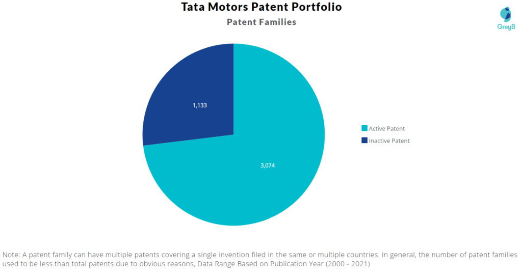 Tata Motors has a total of 13276 patents globally. These patents belong to 6664 unique patent families. Out of 13276 patents, 10120 patents are active.