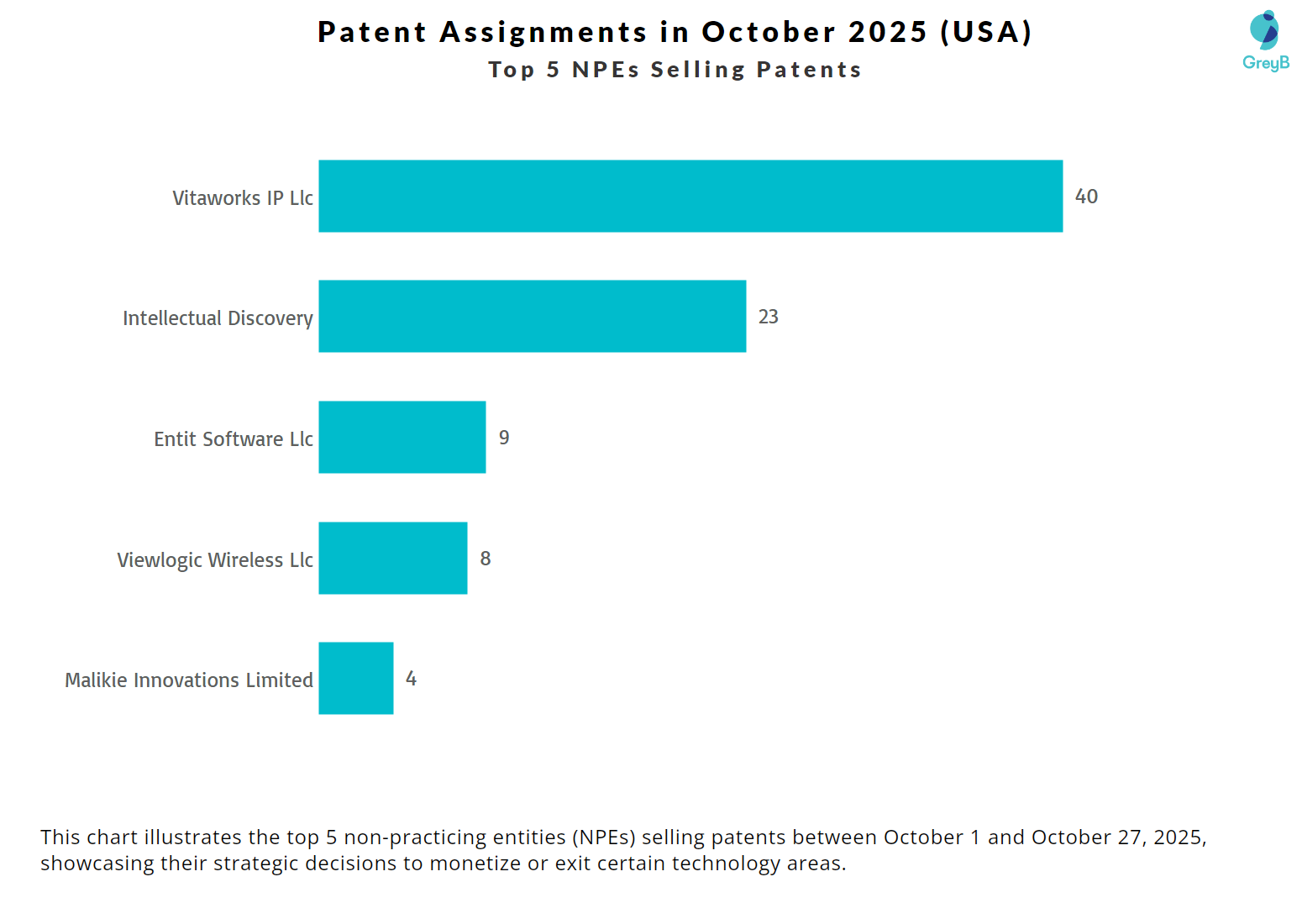 In October 2025, several Non-Practicing Entities (NPEs) made significant moves in the patent market by selling key assets. Vitaworks IP Llc led the way, parting with 40 patents, reflecting its strategy of capitalizing on its portfolio, likely for monetization or strategic realignment. Similarly, Intellectual Discovery followed with 23 patents sold, positioning itself as a key player in IP transactions.