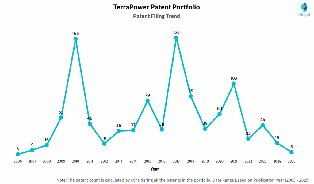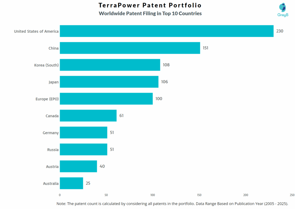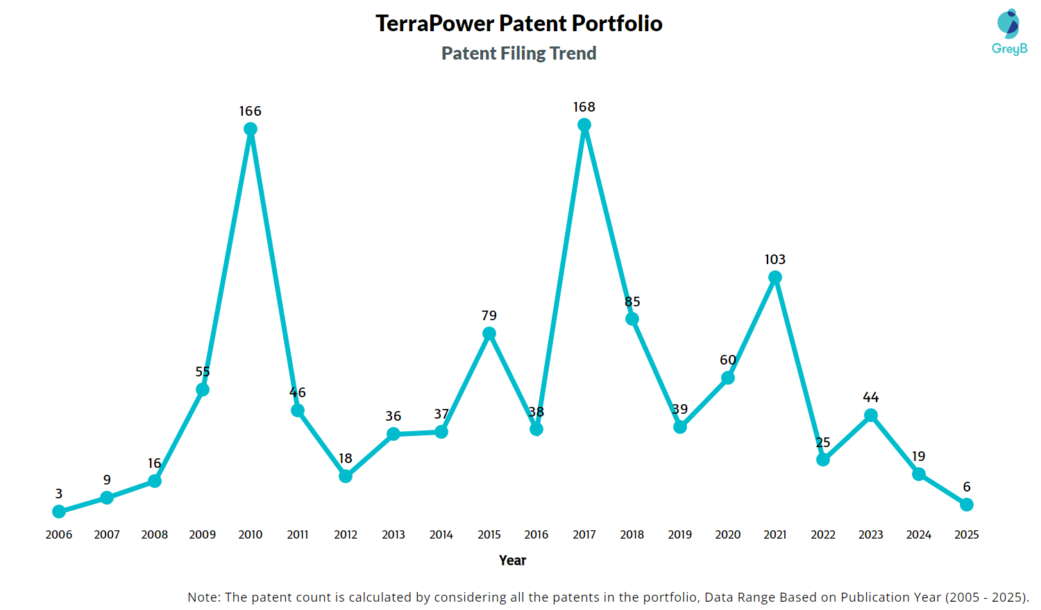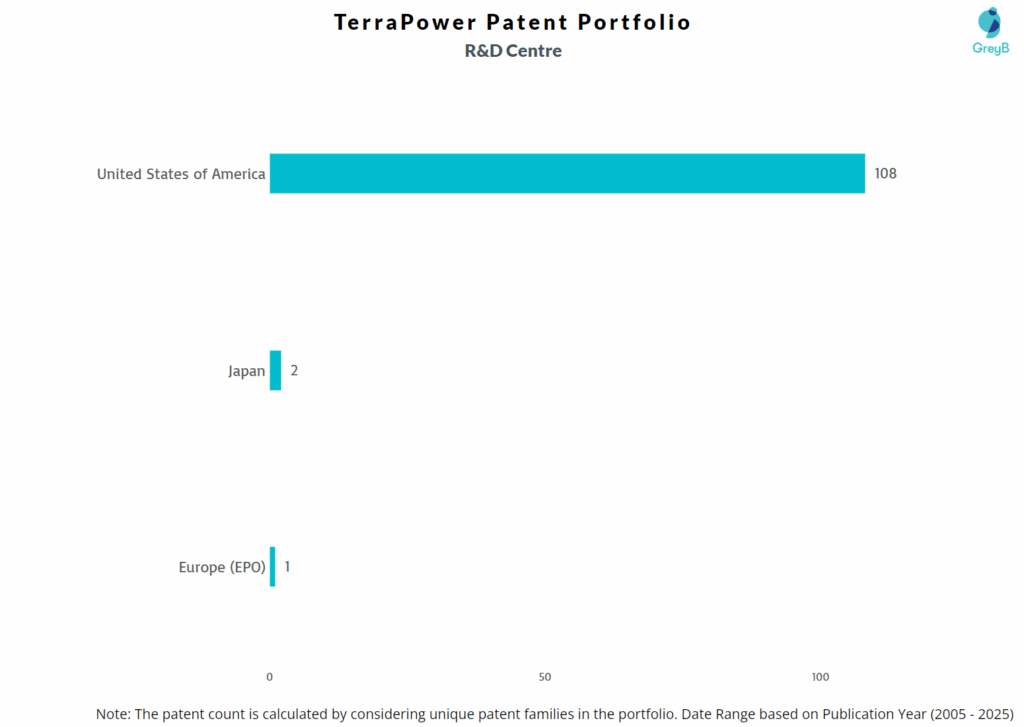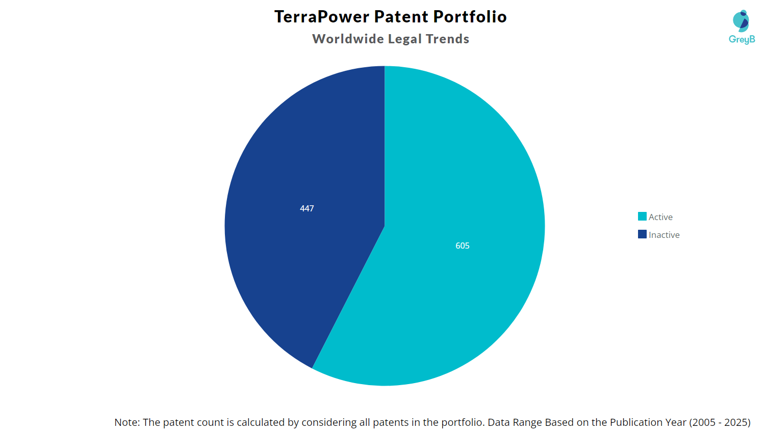 TerraPower has a total of 1052 patents globally. These patents belong to 111 unique patent families. Out of 1052 patents, 605 patents are active.