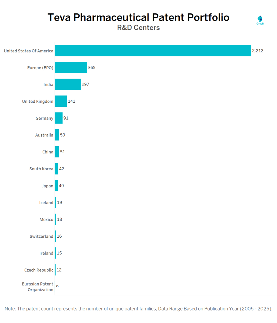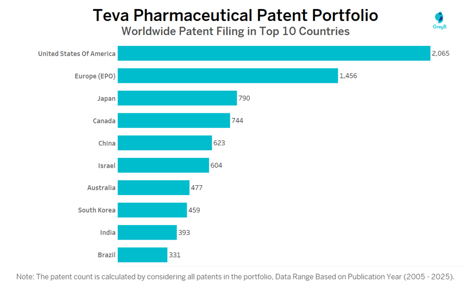 Top Countries in which Teva Pharmaceutical Filed Patents