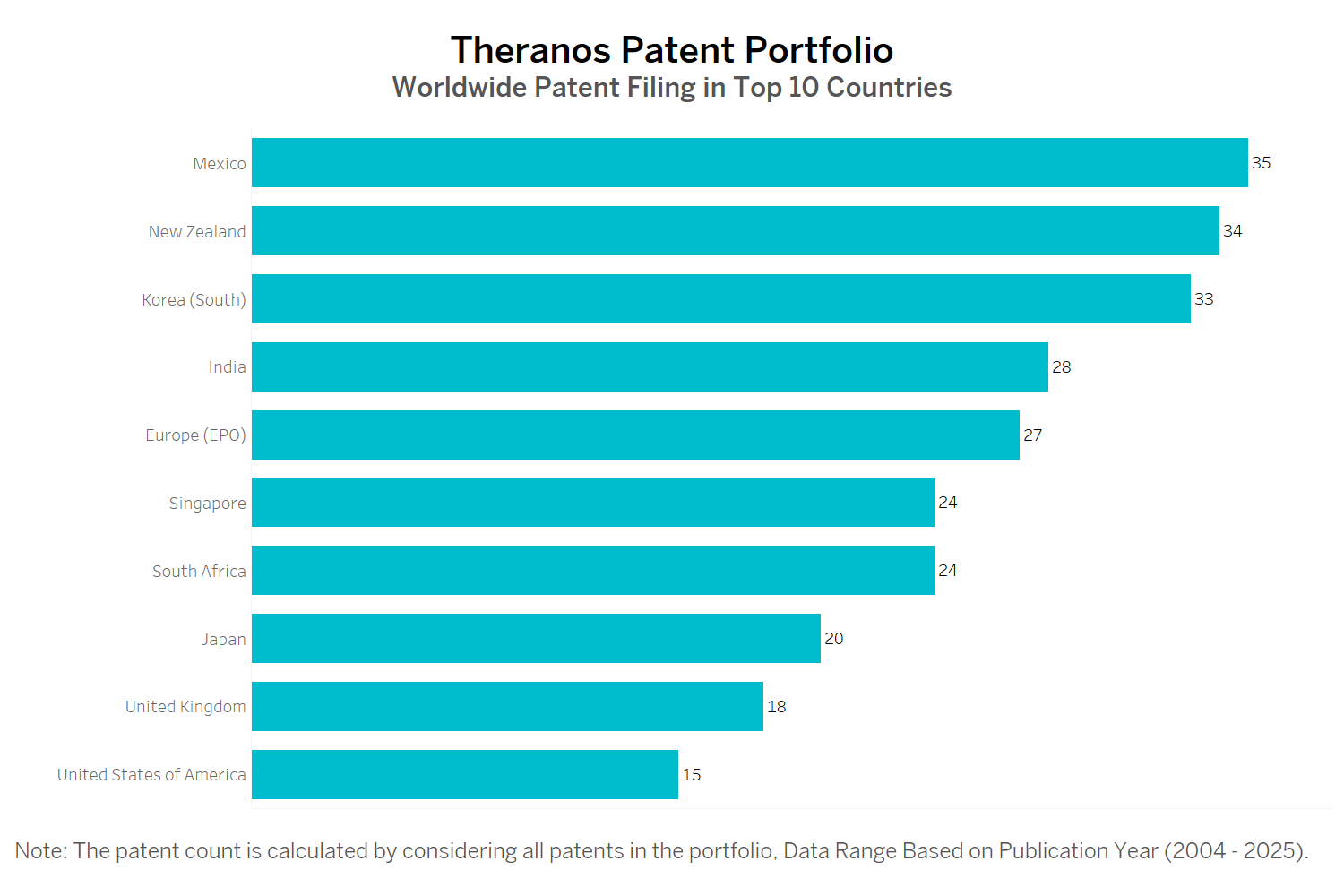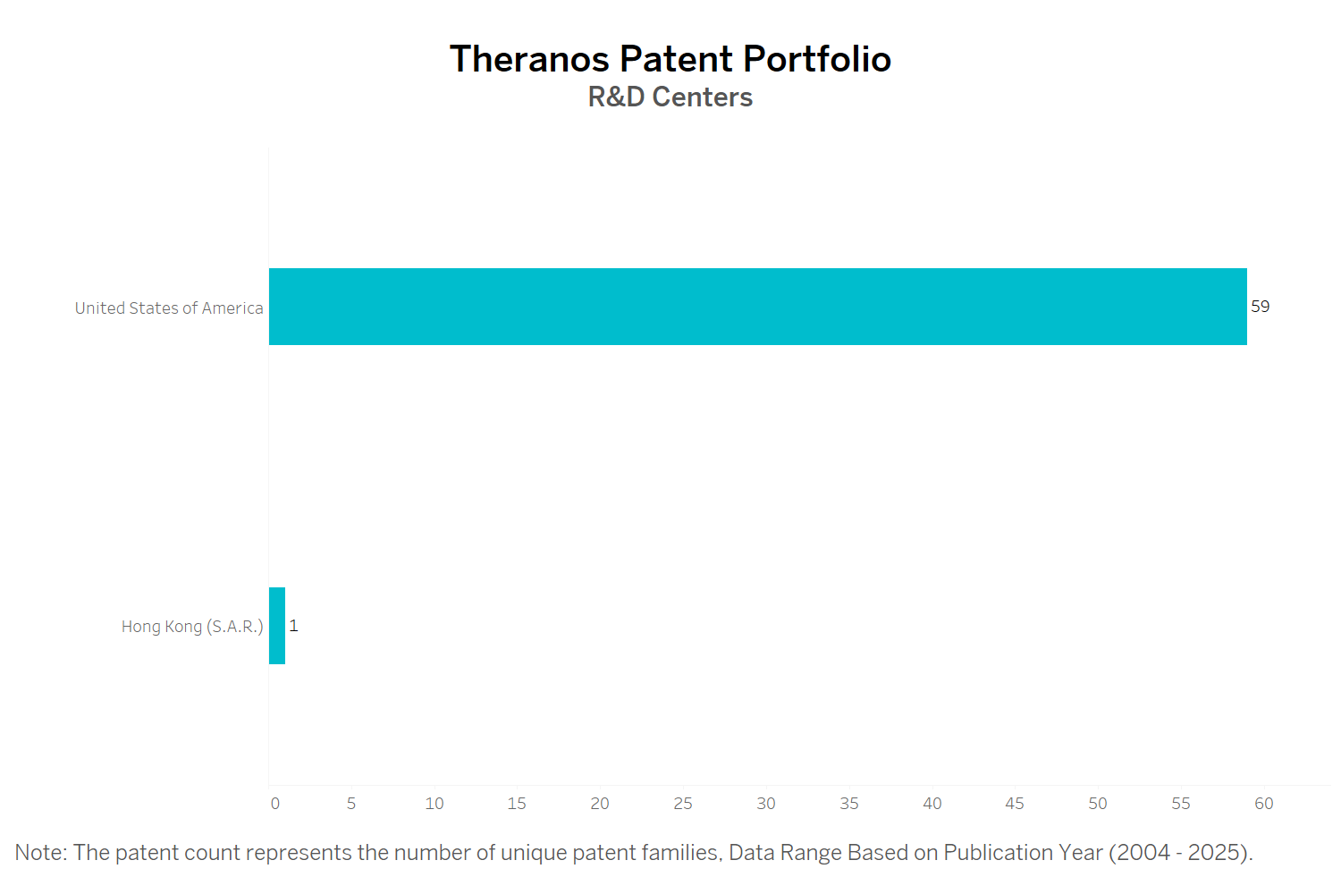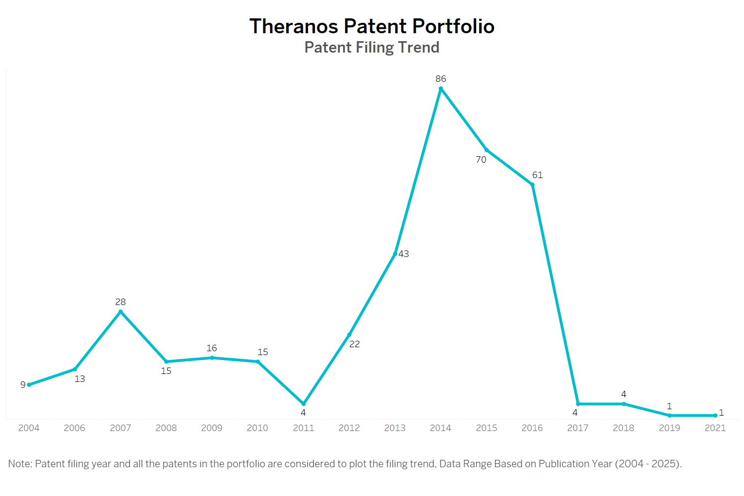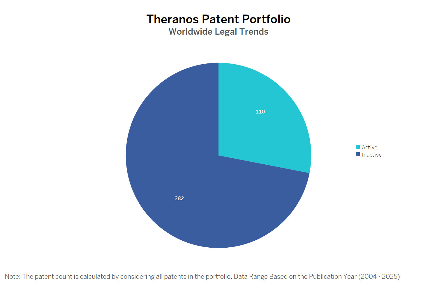 Theranos has a total of 392 patents globally. These patents belong to 60 unique patent families. Out of 392 patents, 110 patents are active.