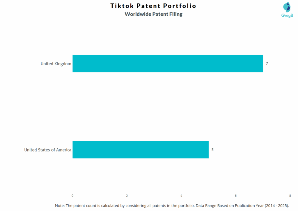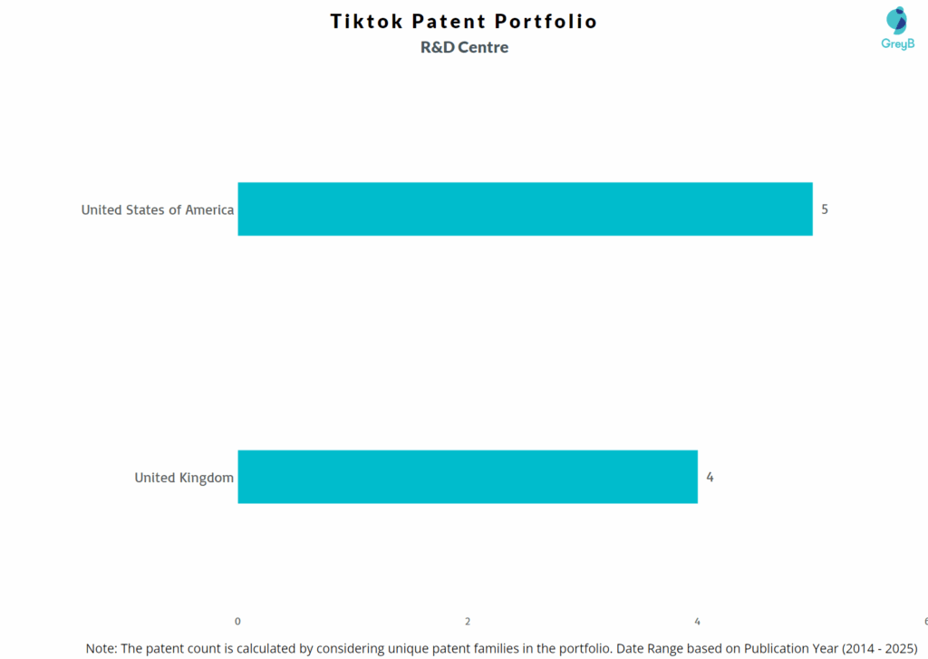Tiktok has a total of 14 patents globally, out of which 4 has been granted. Of these 14 patents, more than 36% patents are active. United Kingdom is where Tiktok has filed the maximum number of patents, followed by United States of America. Parallelly, United Kingdom seems to be the main focused R&D centre and also China is the origin country of Tiktok.