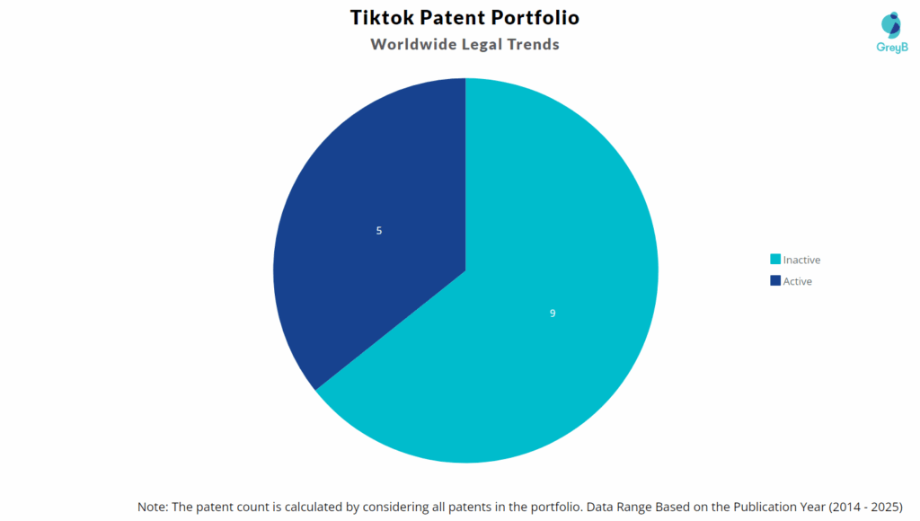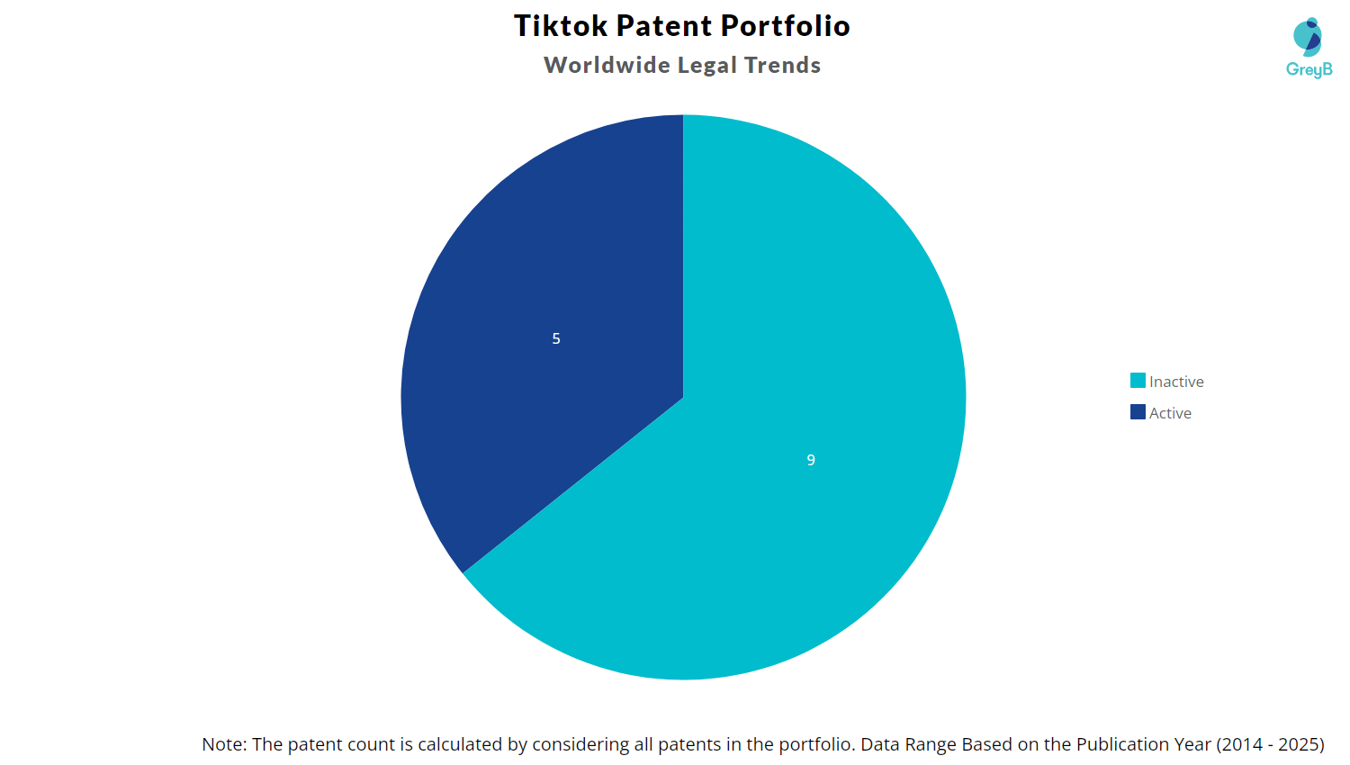 Tiktok has a total of 14 patents globally. These patents belong to 9 unique patent families. Out of 14 patents, 5 patents are active.