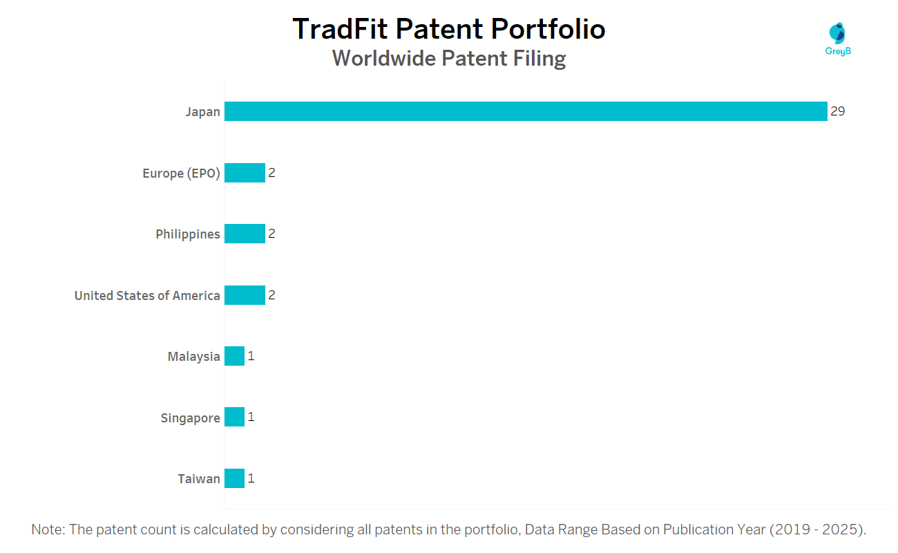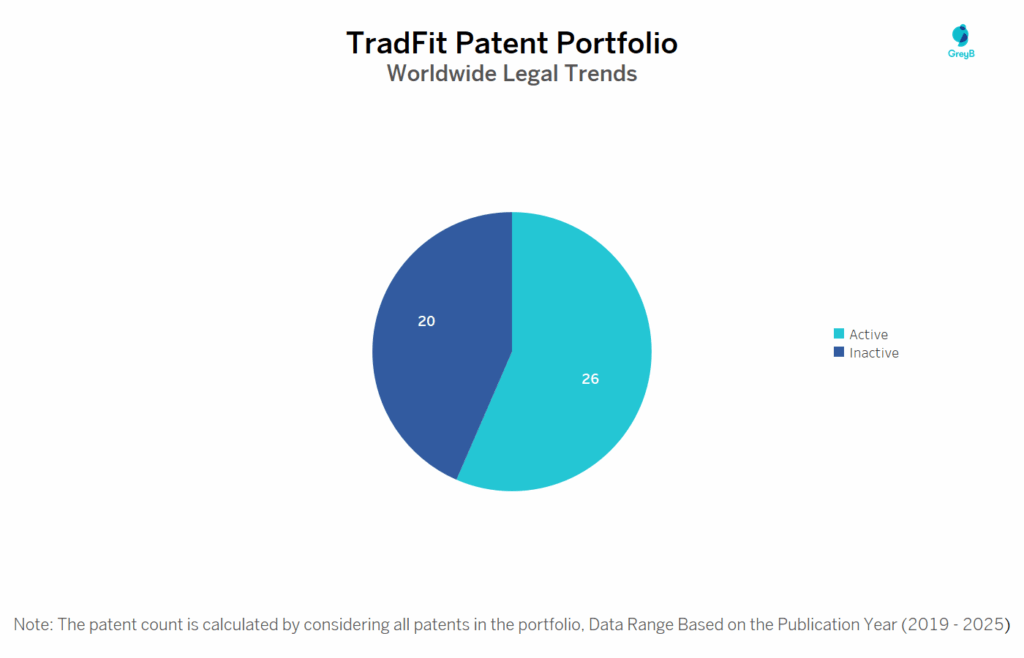 TradFit has a total of 46 patents globally. These patents belong to 7 unique patent families. Out of 46 patents, 26 patents are active.