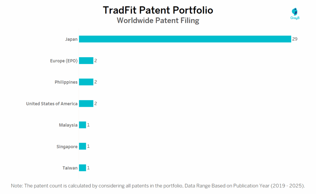 TradFit has a total of 46 patents globally, out of which 18 have been granted. Of these 46 patents, 56% patents are active. Japan is where TradFit has filed the maximum number of patents, followed by Europe (EPO) and The United States of America. Parallelly, the Japan seems to be the main focused R&D centre and is the origin country of TradFit.