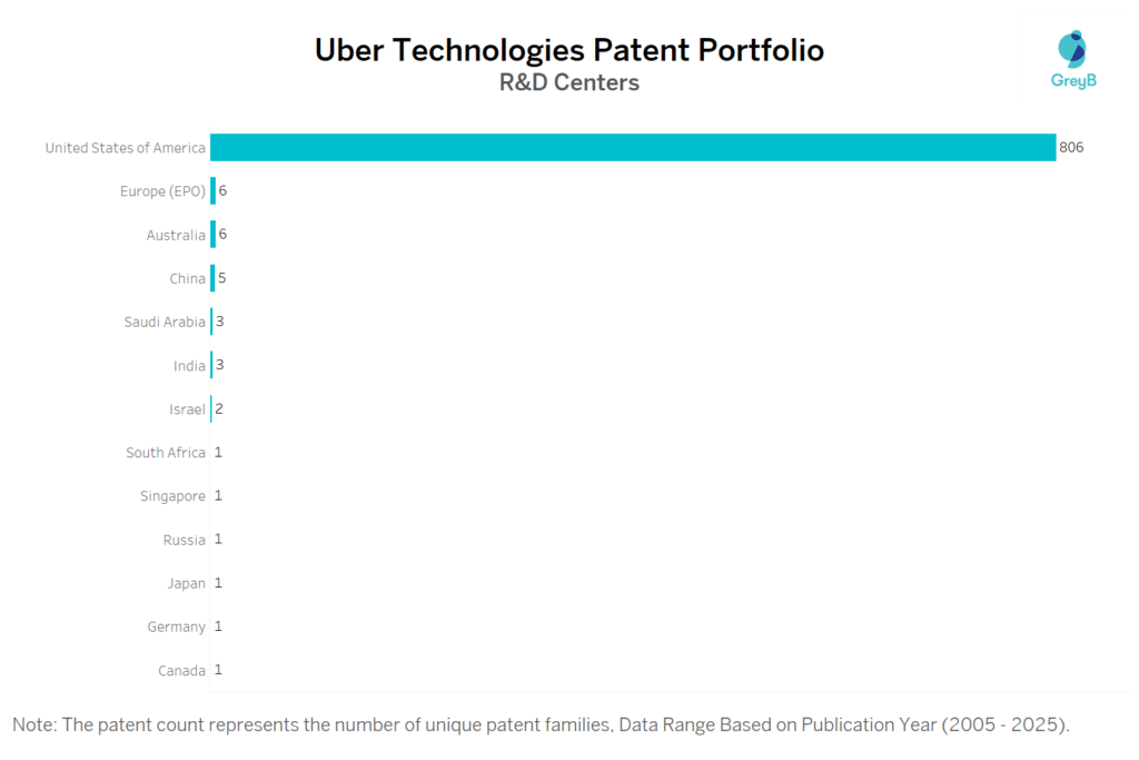 Uber Technologies has a total of 3060 patents globally, out of which 1792 have been granted. Of these 3060 patents, more than 59% patents are active. United States of America is where Uber Technologies has filed the maximum number of patents, followed by Europe (EPO) and Australia. Parallelly, United States of America seems to be the main focused R&D centre and also is the origin country of Uber Technologies.