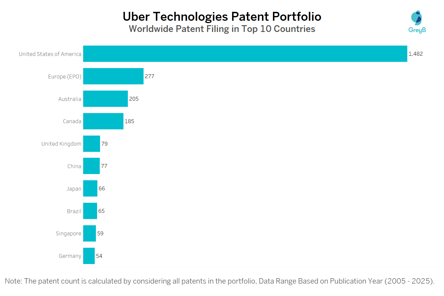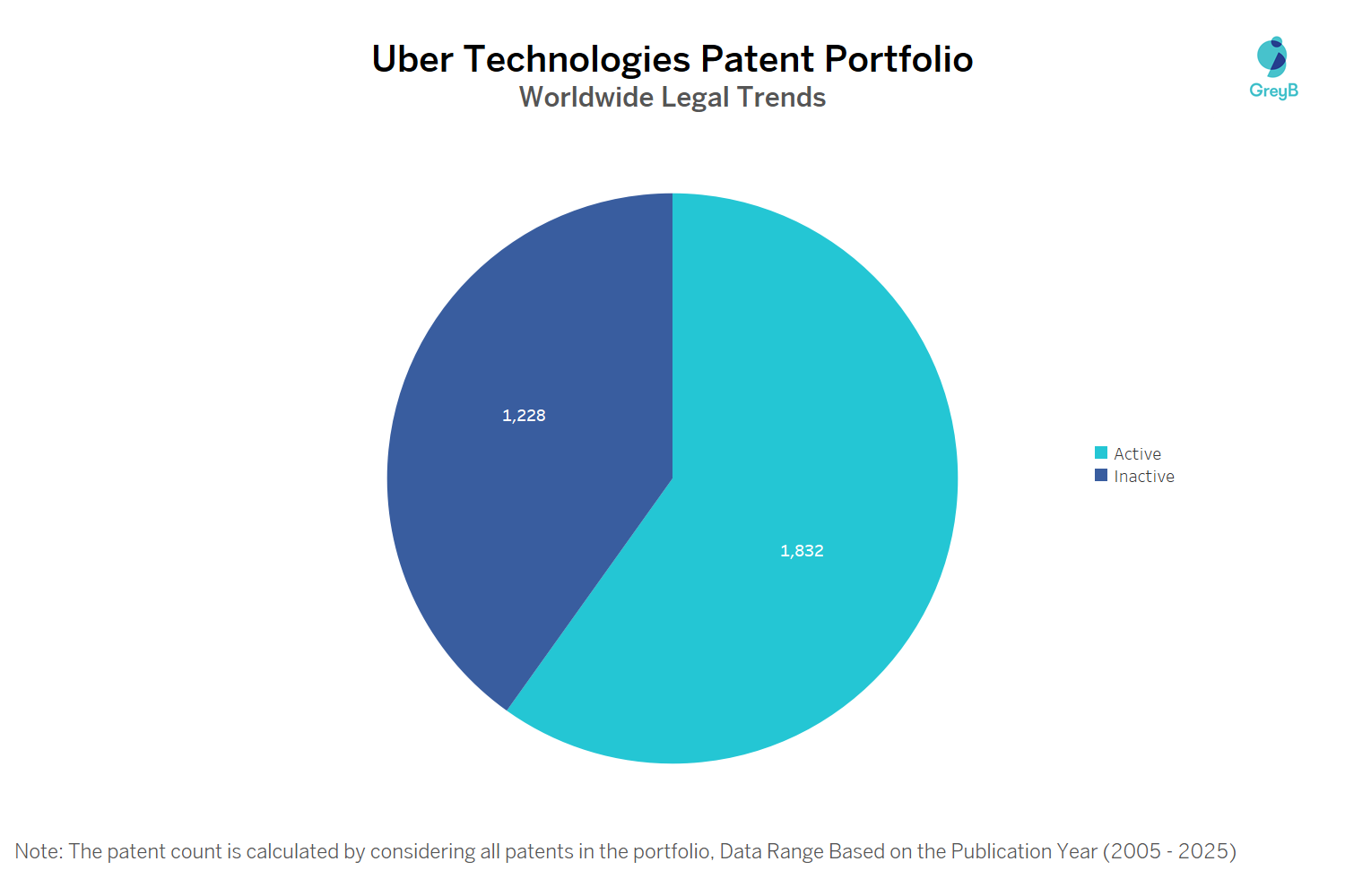 Uber Technologies has a total of 3060 patents globally. These patents belong to 837 unique patent families. Out of 3060 patents, 1832 patents are active.