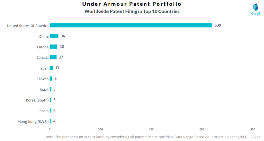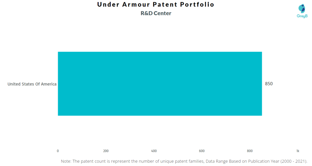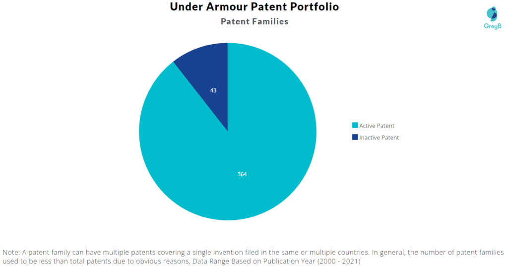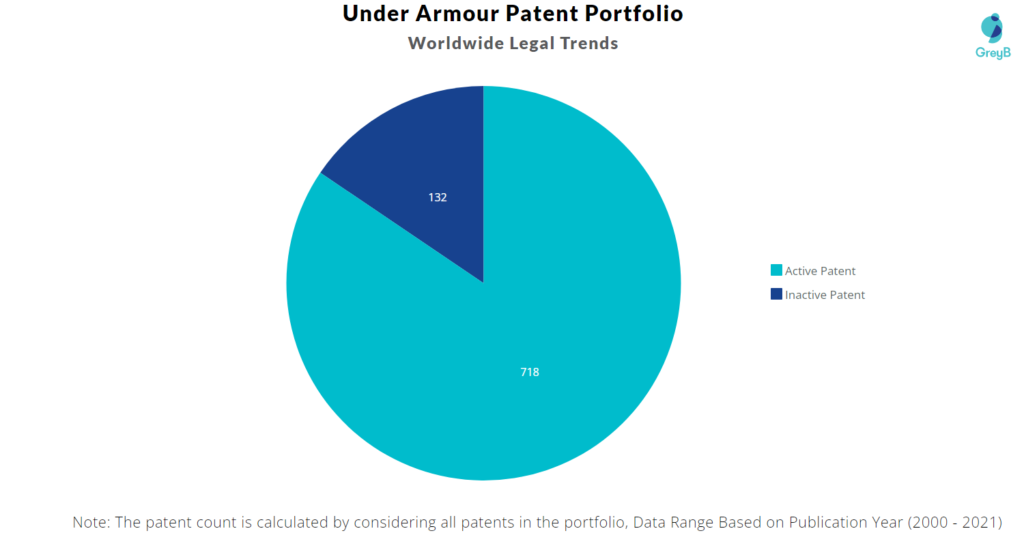 Under Armour has a total of 902 patents globally. These patents belong to 418 unique patent families. Out of 902 patents, 694 patents are active.
