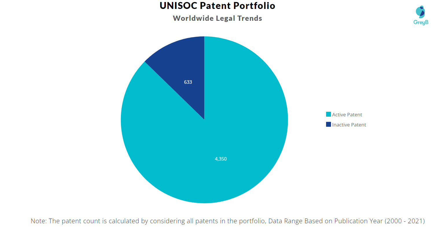 UNISOC has a total of 4933 patents globally. These patents belong to 4123 unique patent families. Out of 4933 patents, 4350 patents are active.